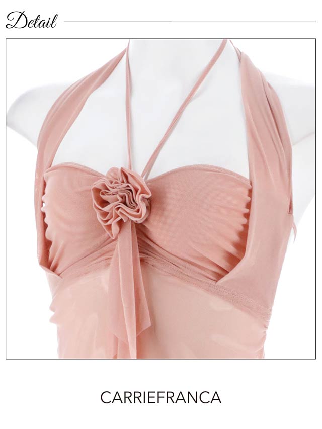大胆に背中を見せるホルターネック仕様でセクシーなバックスタイルに。