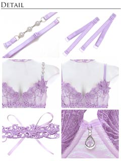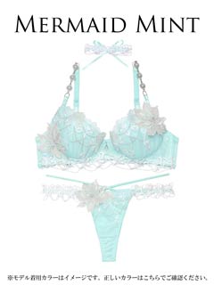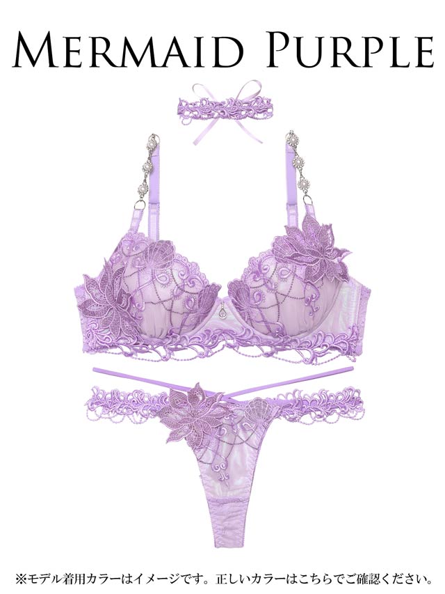昨年大好評だった3c98003シリーズにNewカラー登場!今年はさらにマーメイドをイメージしたカラーリングで登場です! シェルとパールを組み合わせた大人かわいい刺繍レースはラメ糸を使用しているのでキラキラと輝きを放ちます◎刺繍レース下にはオーロラ生地を挟んでいるので、水面の輝きを思わせる涼し気なランジェリーに仕上がりました! サンゴ礁をイメージしたケミカルレースがブラジャーアンダー部分・ショーツサイド・チョーカーに付いているのでとっても豪華です!! パールビジューのストラップなので、オフショルとコーディネートするのも◎。取り外し可能で、付け替え用ストラップも付いてくるので、使用用途によって付け替え自在!かわいくて機能性も抜群なランジェリーを是非手に入れてみてください♪