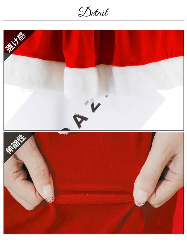 サンタコスプレ商品の白地部分に程度の差はあるものの、メイン生地の色移りがある場合がございます。検品はしっかりと行なっていますが、デザインの仕様上ある程度の色移りが出てしまう旨、ご了承の上ご購入よろしくお願い申し上げます。