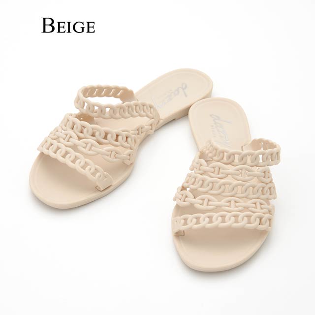 ビーチスタイルにも大活躍するワンカラーチェーン風サンダル。フラットサンダルなので、疲れにくく歩きやすいのがポイント!ビーチスタイルだけでなく、ワンマイルスタイルにも一押しですよ!