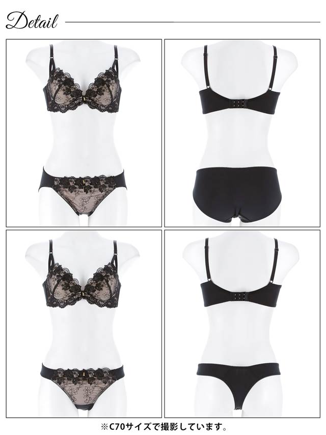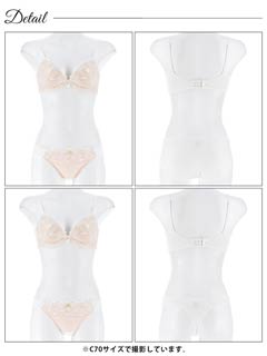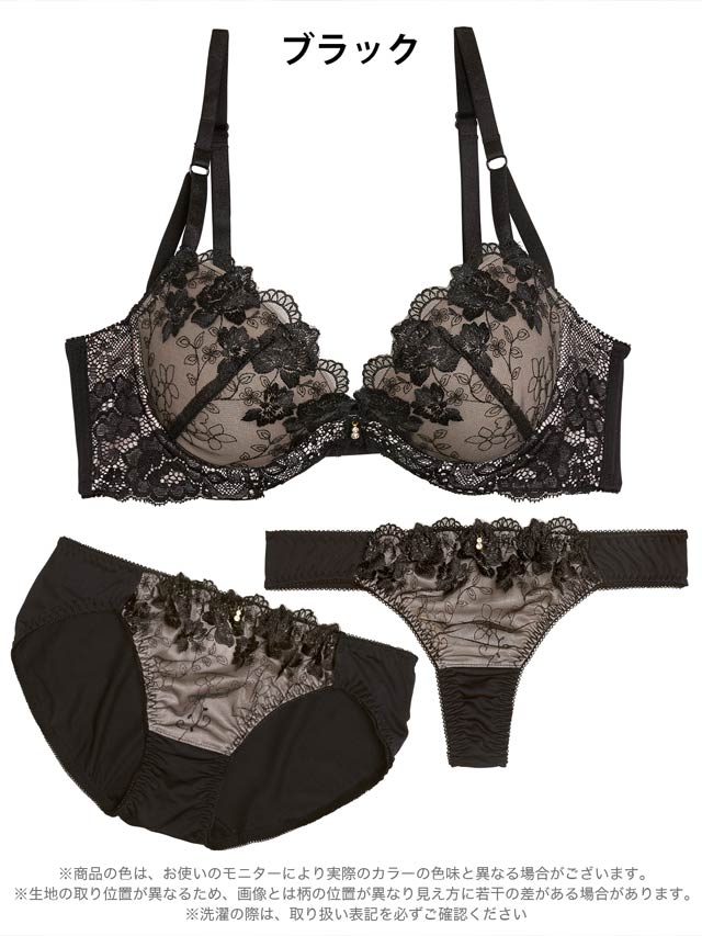 肌馴染みの良いヌーディカラーに花々の 刺繍を重ねた大人セクシーなランジェリー。繊細なアーチデザインのレースや中央の煌びやかなチャームが華やかさをプラスするアクセントに◎ フルバック・Tバックが両方ついたお得な3点セットです。