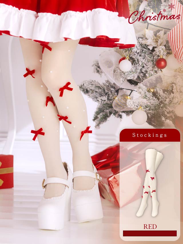 11/14新作!大きめ赤リボンにパールがちりばめられたCUTEなストッキング【2025サンタ/コスプレ】