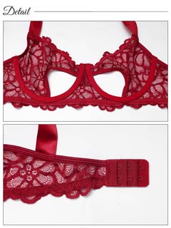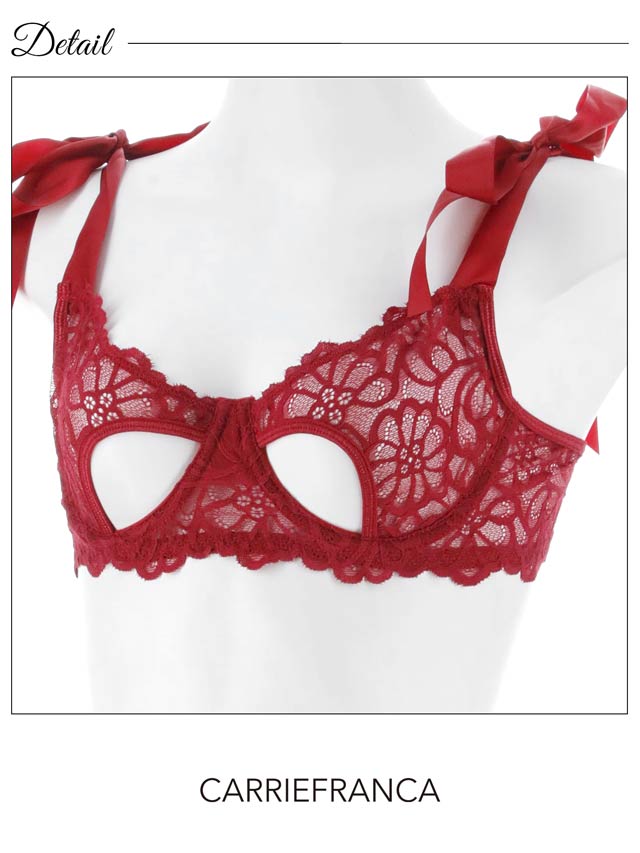 鮮やかなレッドのレースと大胆なカットアウトが視線を惹きつける、華やかで色っぽいランジェリー。