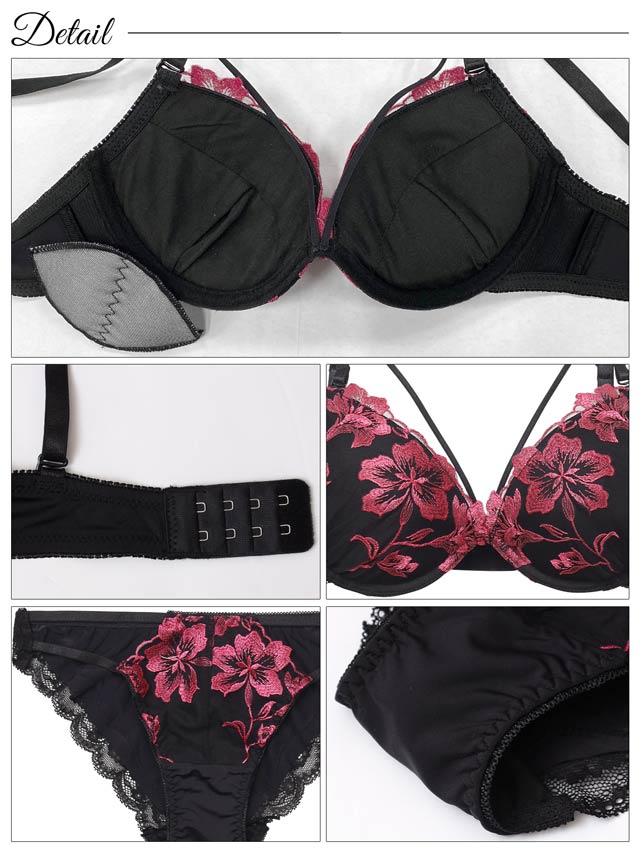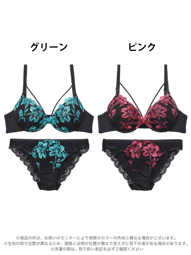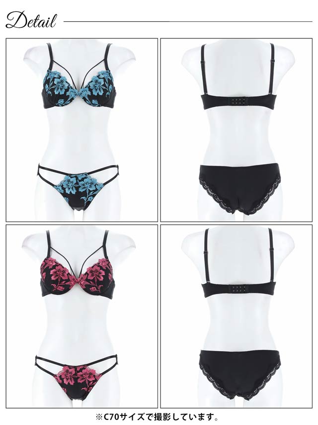 【GHIサイズ】【3点セット】サテンフラワークロスコード育乳脇高ブラジャー&バック透けフルバック&Tバック