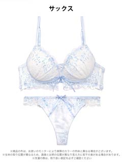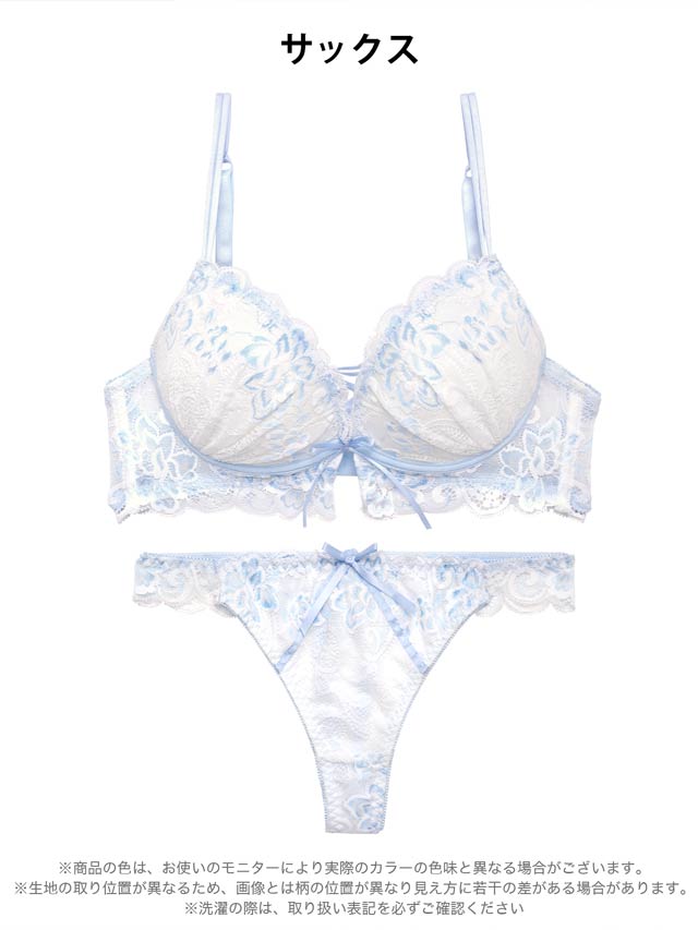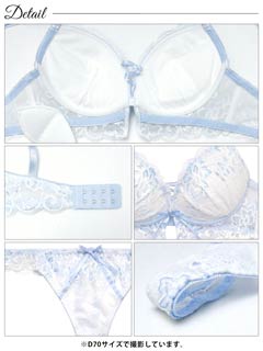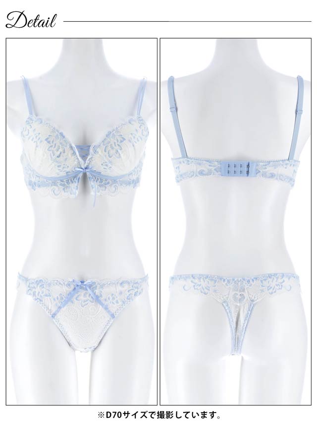 パステルカラーの優しい雰囲気と、繊細なフラワーレースが魅力のフェミニンなランジェリー。胸元にはレースアップデザインをあしらい、より一層可愛らしい仕上がりに♪ショーツはバック透けレース仕様で、清楚な印象の中にちょっぴりセクシーさをプラスしました◎