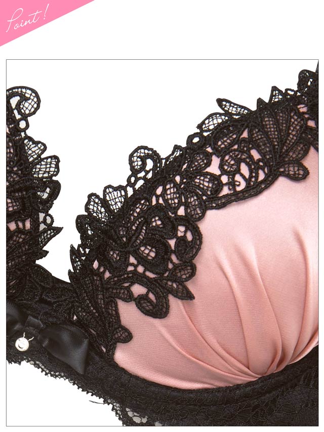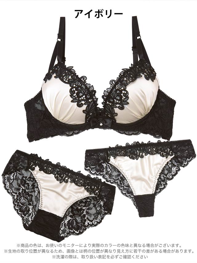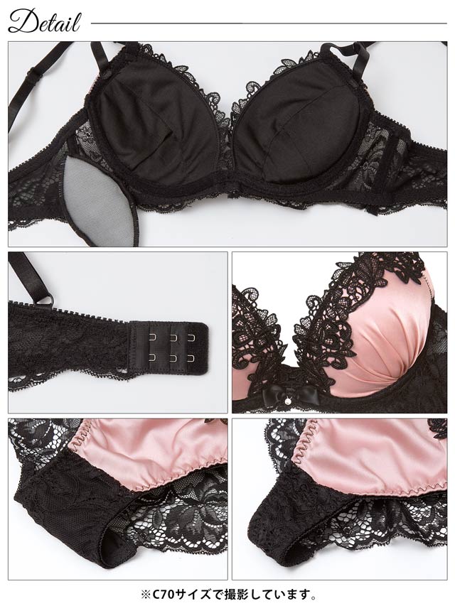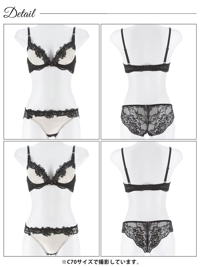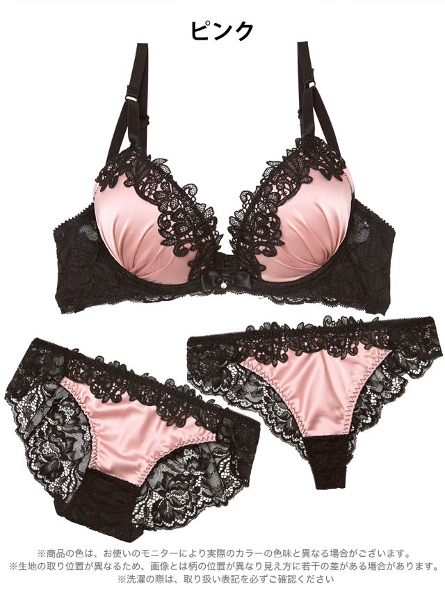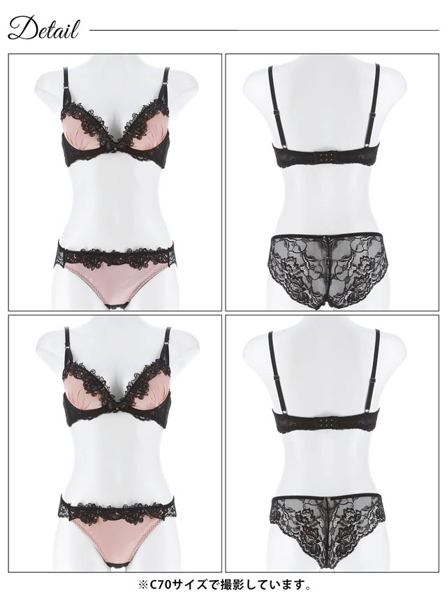 サテン生地に黒のケミカルレースが大人可愛いランジェリー。バック透けデザインでセクシーさをプラスします。三点セットなので気分でショーツを変えられるのが魅力的です◎