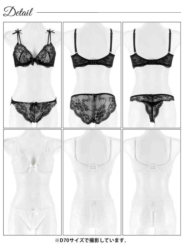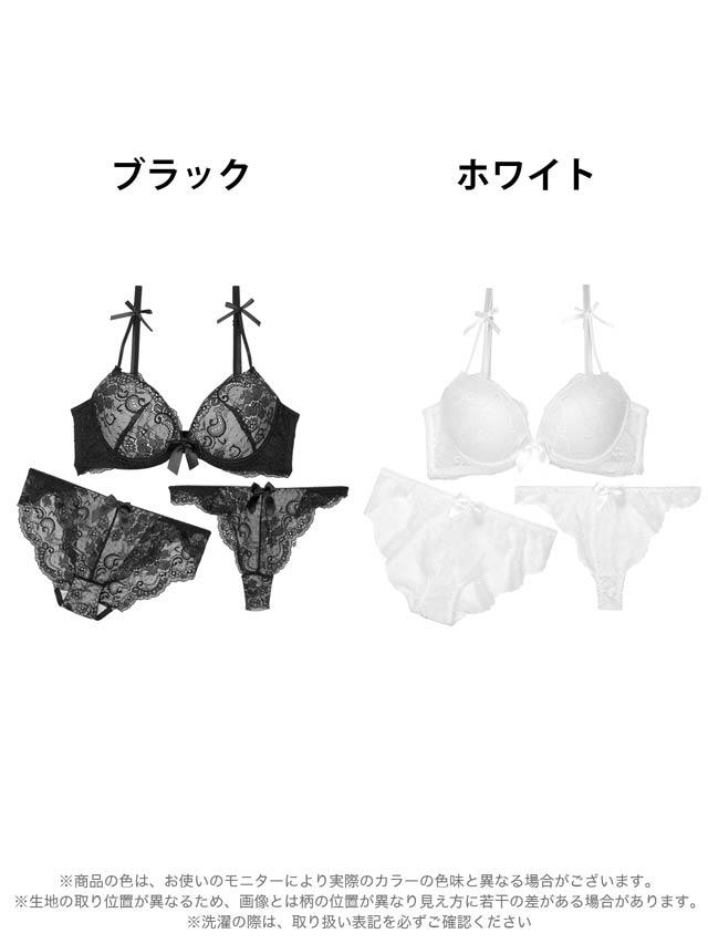 【3点セット】モノトーンレーシィリボン育乳脇高ブラジャー&バック透けフルバック&Tバックショーツ[大人気]