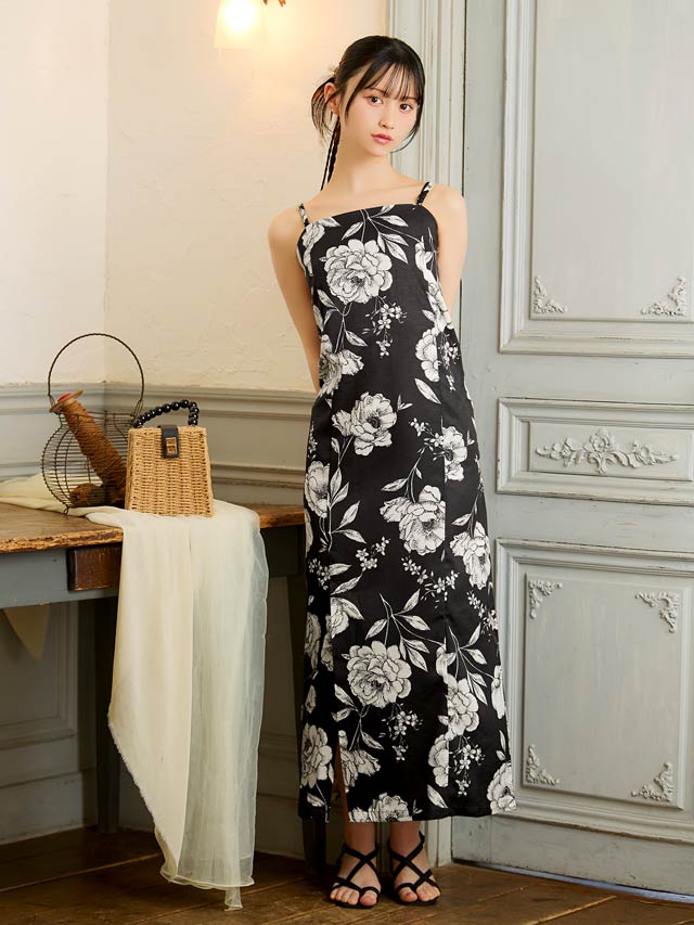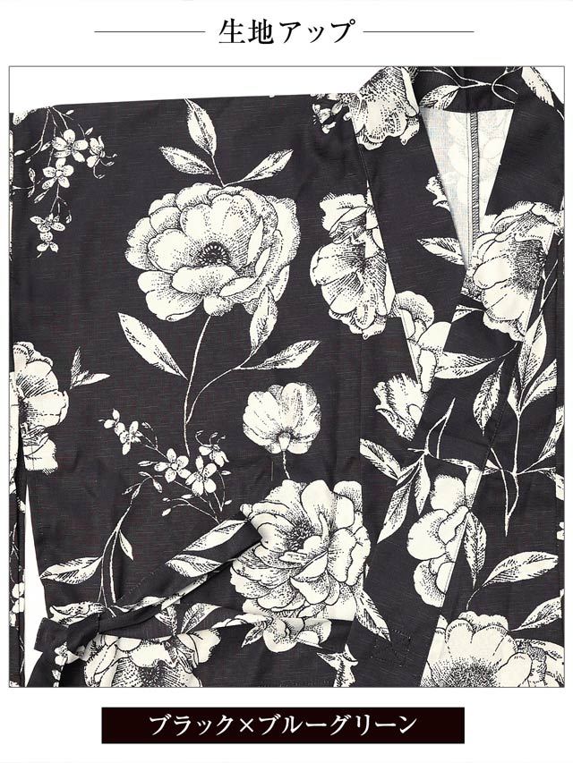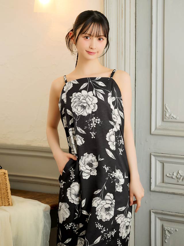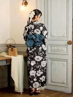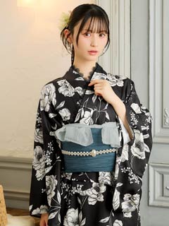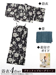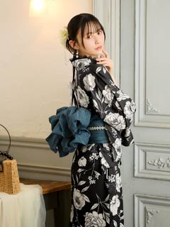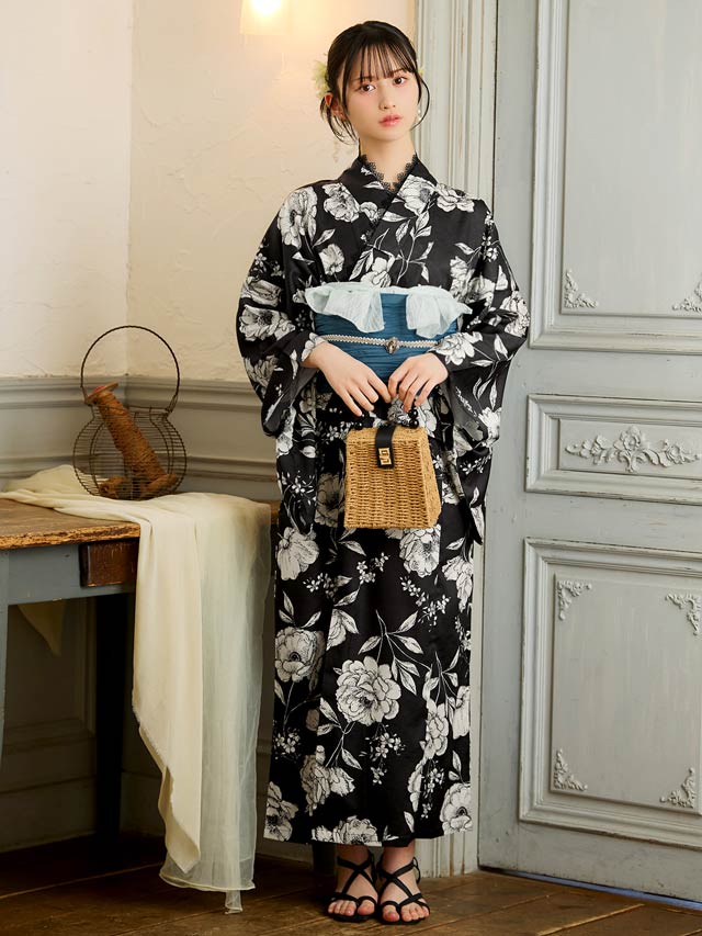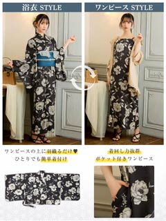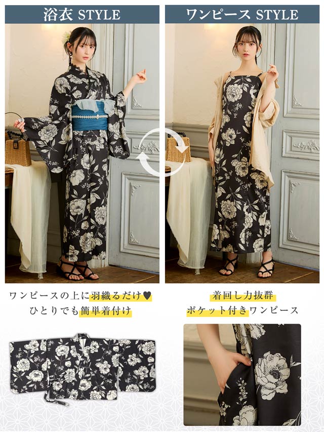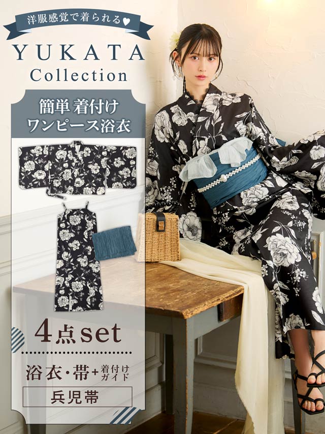 [ワンピース浴衣] 漆黒×レトロ白薔薇柄[4点SET]【2025年新作/YUKATA by dazzy】