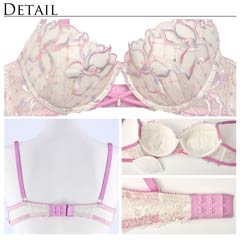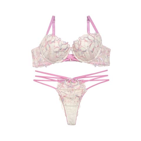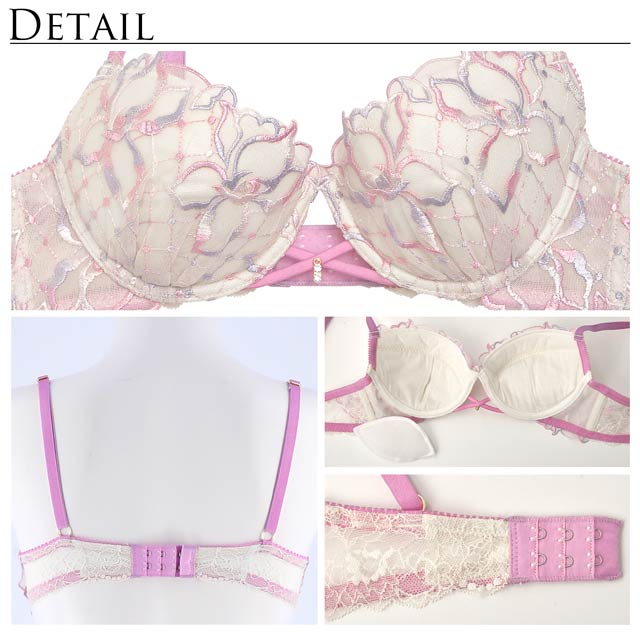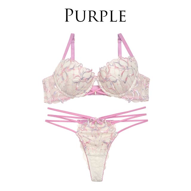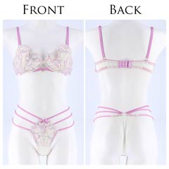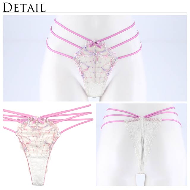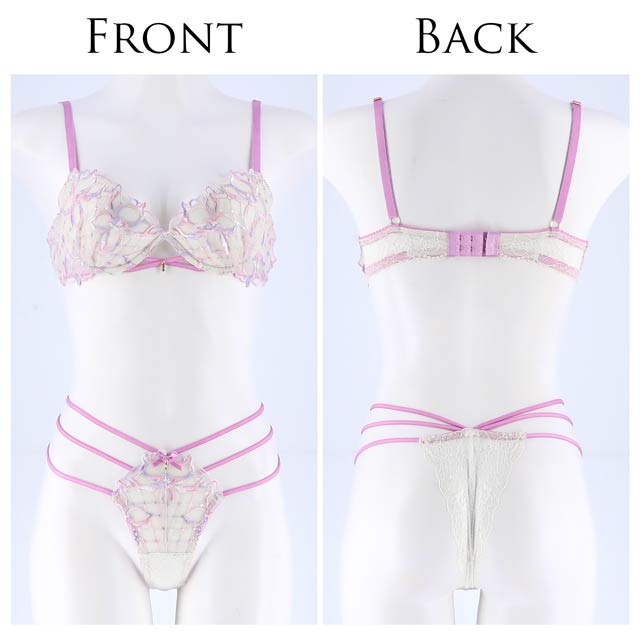 まるで女神のような印象のブラ&Tバックセット。繊細な刺繍、アンダーのクロスコードとラインストーンチャームがポイント。ブラカップは、胸に優しくフィットする「立体裁断カップ」仕様。パッドも胸のボリューム調節がしやすいように取り外し可能です。ショーツは複雑に絡むコードがセンシュアルなバックレースデザイン。
