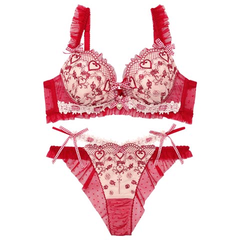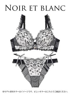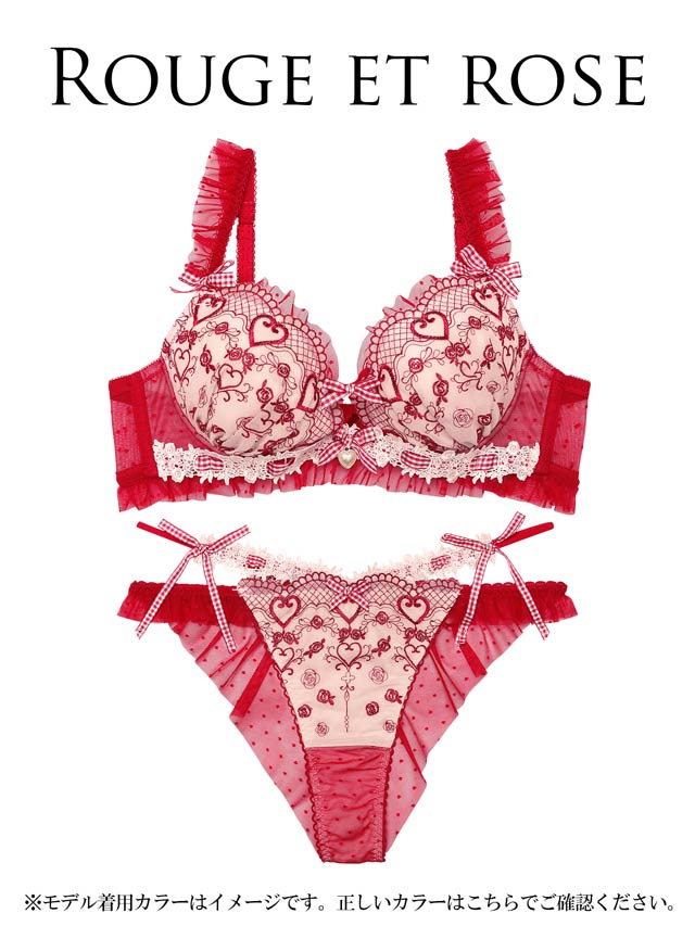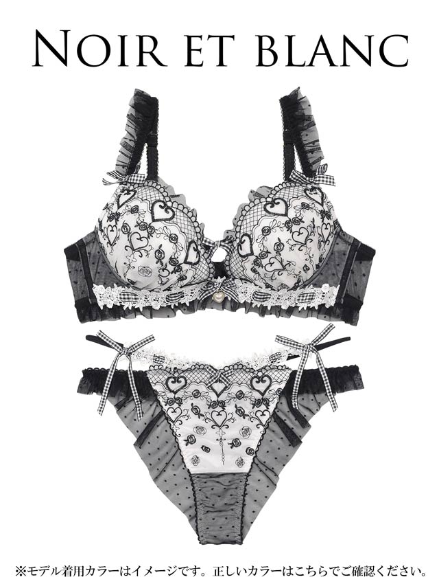 フランスの少女をイメージしたフレンチガーリーなランジェリーが新登場♪ハートや小さな薔薇を刺繍した繊細なレースはキラキラ輝く布地に刺繍しています!薔薇のはしごレースにギンガムチェックリボンをきゅっと結んだようなデザイン!ブラの前にはハートパールのチャームが可愛い◎肩やフリルはドット柄のチュールをギャザーをたっぷり寄せているので女の子らしいフワッとしたシルエット!ショーツのウエストはギンガムチェックリボンを手結びしているようなデザイン、解けないタイプなので着脱も楽に簡単♪ モノトーンのシックなフレンチガーリーなnoir et blancと、ルージュのようなレッドが可愛いrouge et roseの2色展開です!