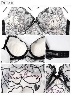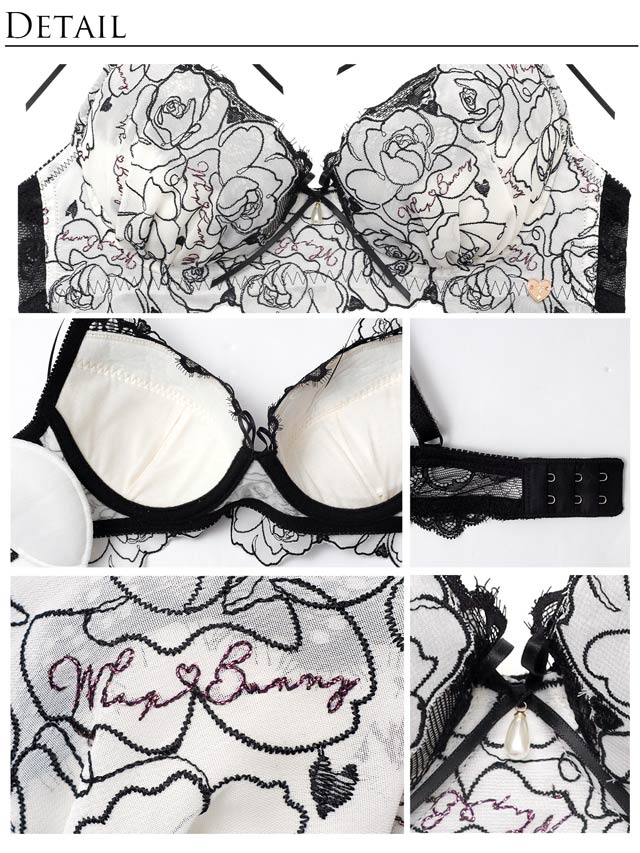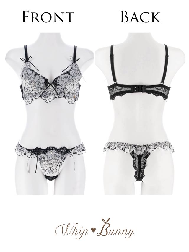 線描きの大きなローズとWhip Bunnyのロゴが入ったオリジナル柄をシフォン生地に刺繍した、まるでハンカチーフのようなかわいさをまとったランジェリーです◎
