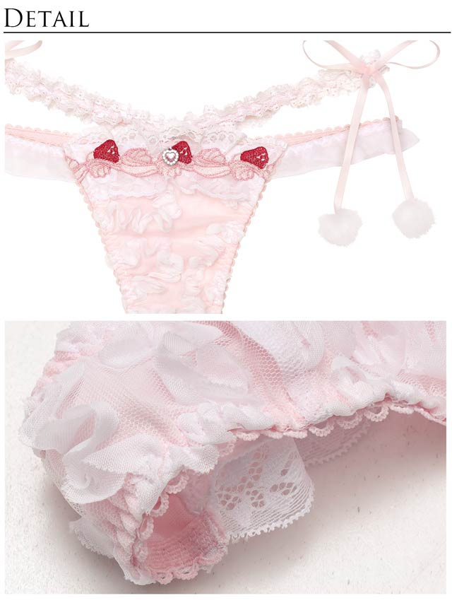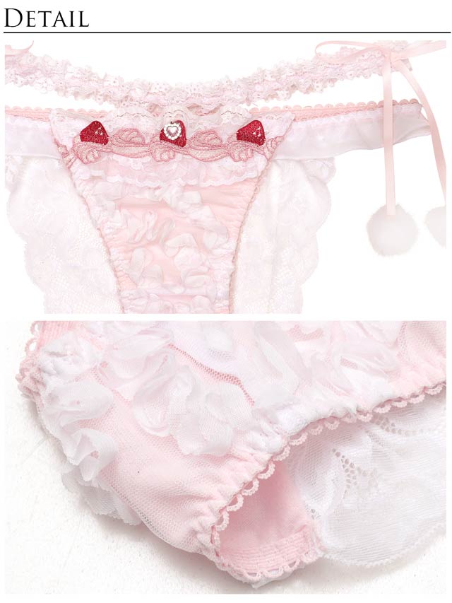 まるでショートケーキになったみたい♪ホイップクリームにたっぷり包まれているかのようなスイーツランジェリーが登場! ホイップクリームのような立体的なホワイトフリルチュールがふわふわ!いちごとクリームを描いたレースは赤とピンク色のラメ糸でキラキラします! ショーツにはリボンの白ポンポンつき!フリルとリボンは取り外しができるのでお洗濯も安心です!