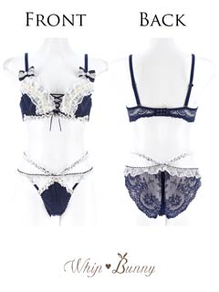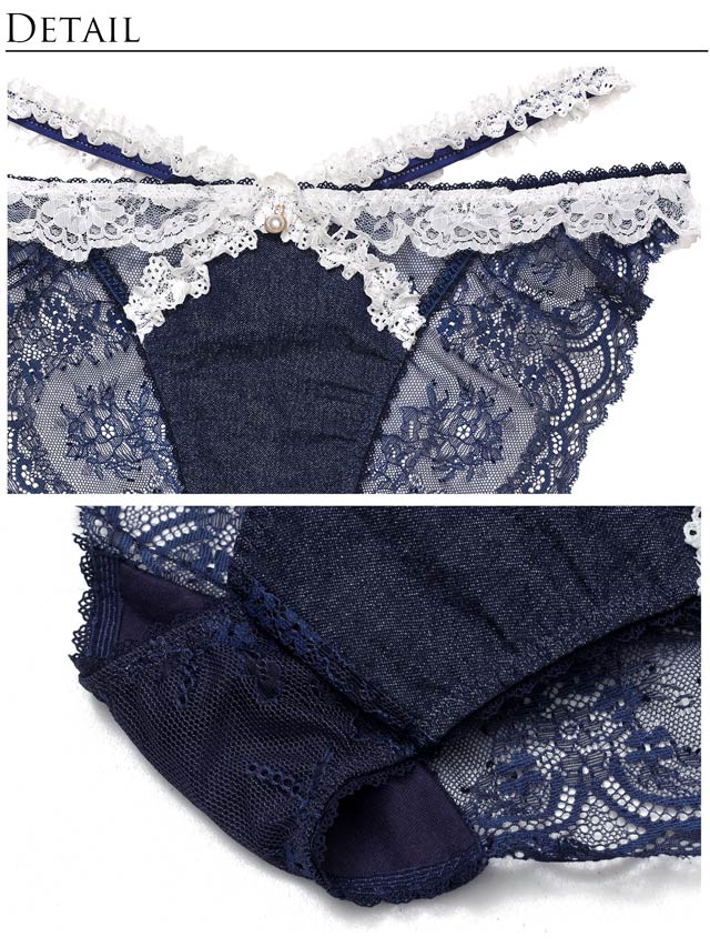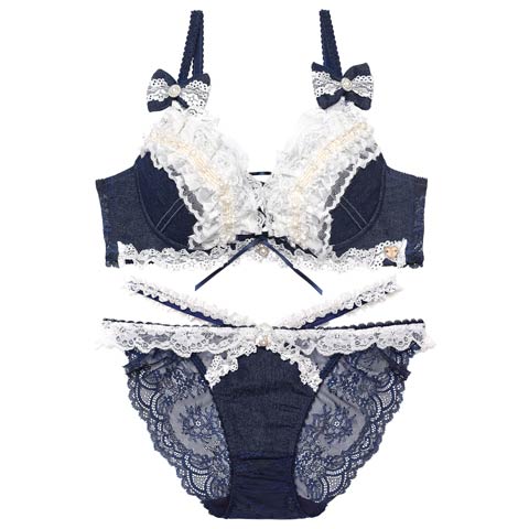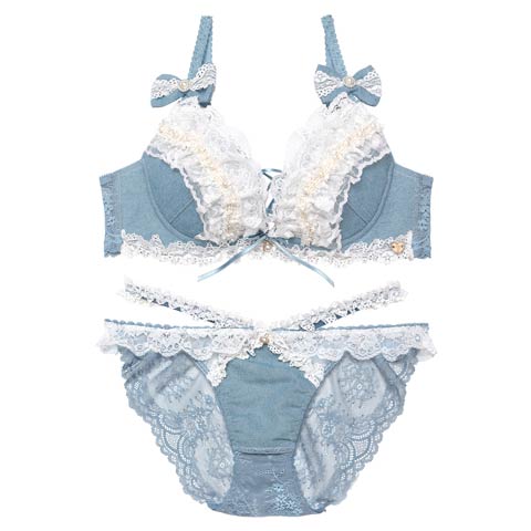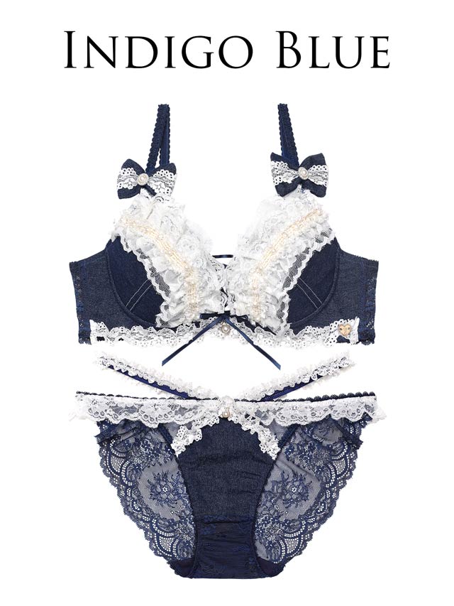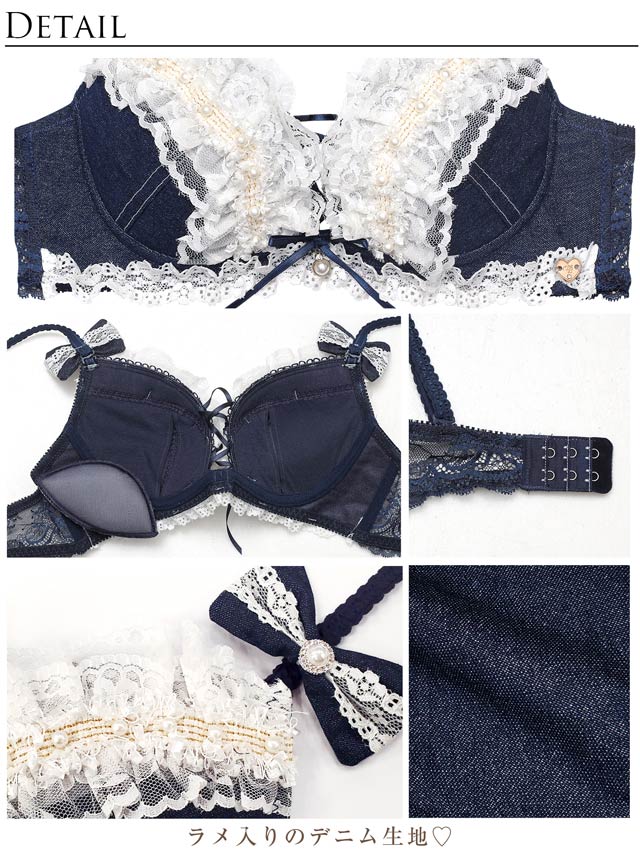 デニム生地のランジェリーがついに登場!ラメ入りのデニム生地に、レースとチュールのティアードフリル、パールブレードを重ねた、まるでお洋服のようなオシャレなランジェリー! ブラジャー中心には編み上げリボンデザイン。脇からしっかりとお肉を寄せて谷間をメイクしてくれます!ストラップ上にはデニム×レースのリボンまで付いていてとってもかわいい♪ リボンはストラップごと取り外しができるので、気になる場合は付属のストラップと付け替えてオシャレを楽しんでくださいね! ショーツもたっぷりフリルのデザインでとってもプリティー♪レースフリルをあえてボトムスから出しで着てもかわいいですよ! シンプルなショーツを希望する方には、デザイン違いの単品ショーツを一緒に購入することをオススメします!