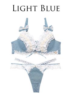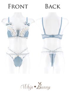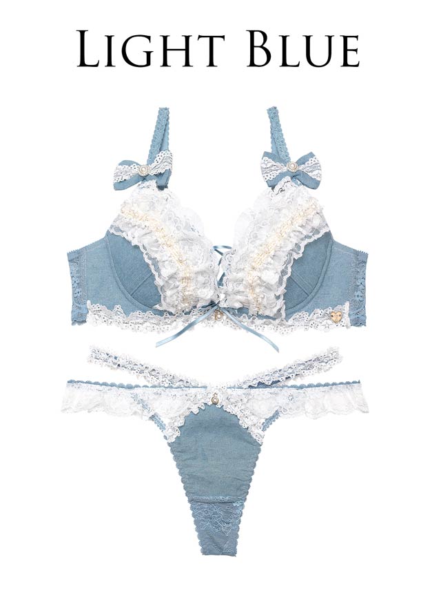 デニム生地のランジェリーがついに登場!ラメ入りのデニム生地に、レースとチュールのティアードフリル、パールブレードを重ねた、まるでお洋服のようなオシャレなランジェリー! ブラジャー中心には編み上げリボンデザイン。脇からしっかりとお肉を寄せて谷間をメイクしてくれます!ストラップ上にはデニム×レースのリボンまで付いていてとってもかわいい♪ リボンはストラップごと取り外しができるので、気になる場合は付属のストラップと付け替えてオシャレを楽しんでくださいね! ショーツもたっぷりフリルのデザインでとってもプリティー♪レースフリルをあえてボトムスから出しで着てもかわいいですよ! シンプルなショーツを希望する方には、デザイン違いの単品ショーツを一緒に購入することをオススメします!