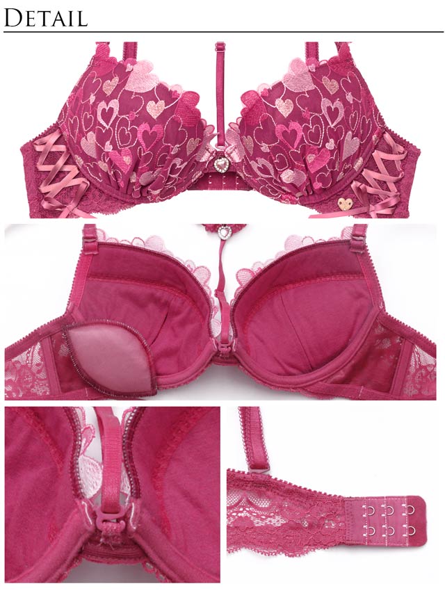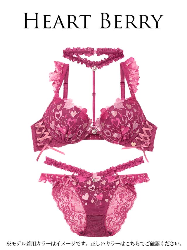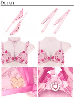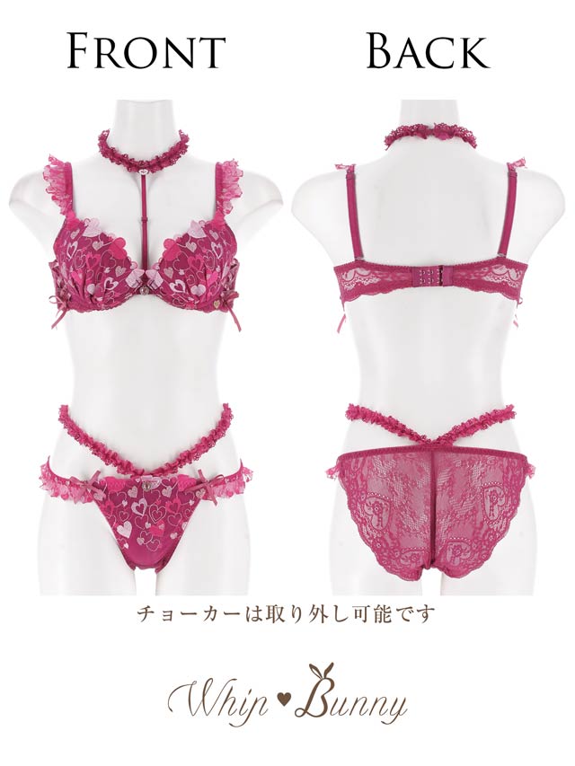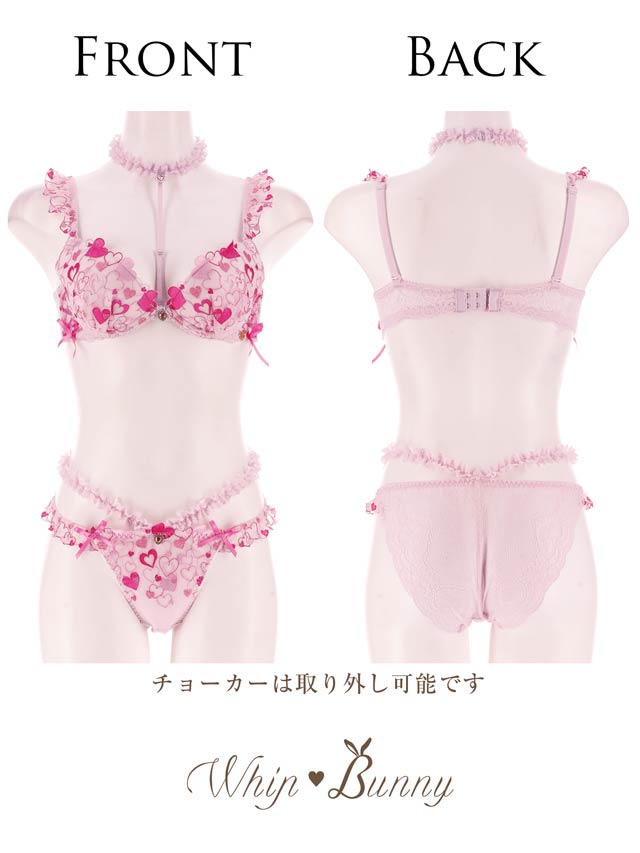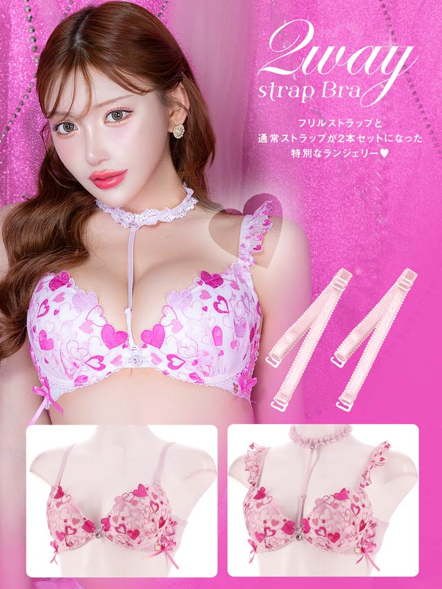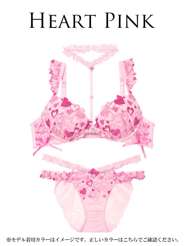 ラブリーなハートランジェリーの登場です♪色んな色のハートを詰め込んだ刺繍レースに編み上げデザインをプラス。肩にも小さいハート刺繍のフリルをたっぷりと… フリルストラップは取り外し可能なので、お洋服に響いてしまう場合には付属の付け替え用ノーマルストラップとチェンジして、その日の気分でコーディネートしてくださいね!チョーカーも取り外し可能です! ショーツサイドにもハート刺繍のフリルと、ウエストにはやわらかいレースフリルを付けてます!ボトムスから見せてしまうのもおしゃれ上級者! 見えるのが嫌な人はウエストレース無しの単品ショーツもご用意しております!是非合わせてGETしてコーディネートを楽しんでくださいね!