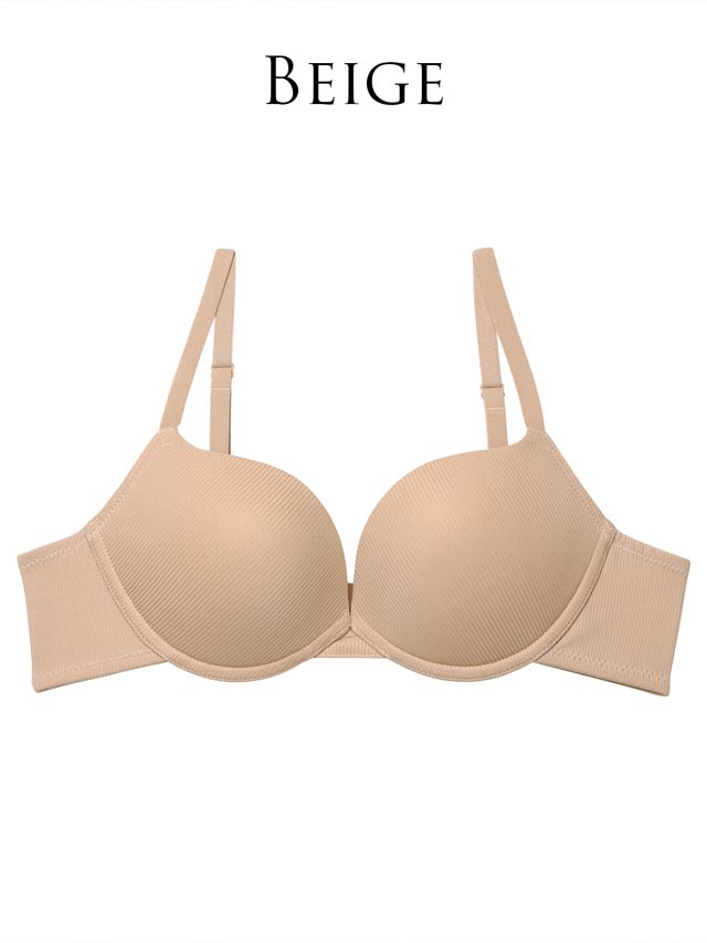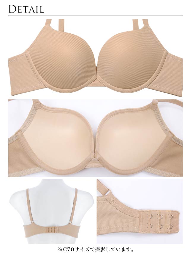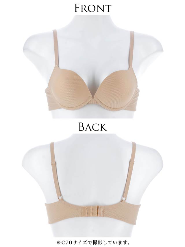 リブ生地を全体に使用したスタイリッシュランジェリー。(表に響かないTシャツブラ)カップ脇から中心に向かってのラインがスタイリッシュで華奢見えするのがポイント。 アンダーフリーパターンで中心の土台細くしたことで華奢さを強調させています。 日常使いに重視し、背中はU字バックで2段ホックシルエットにしています。安定の着心地がポイント!