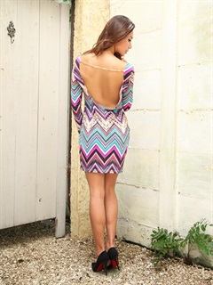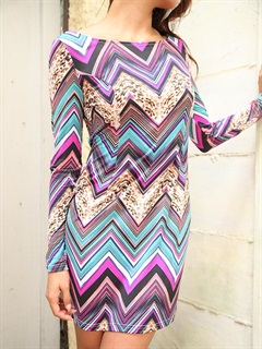 カラフルなサイケデリック柄が印象的なワンピース。大きく開いた背中にはチェーンがポイントであしらわれておりバックスタイルを綺麗に見せてくれます!つるっとしたストレッチ生地なので着心地もばっちり!長袖なので冷房の効いた室内や日焼け予防にも♪