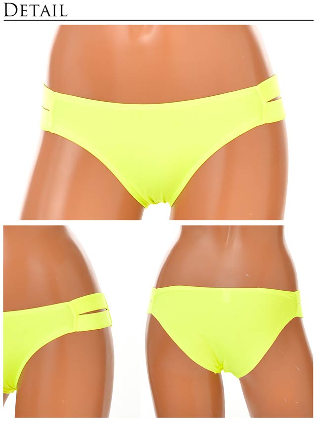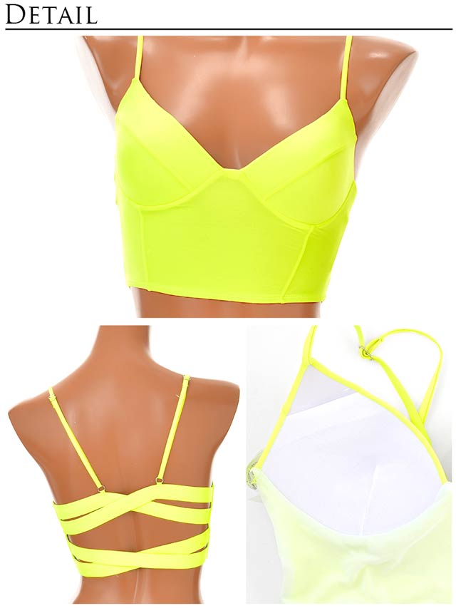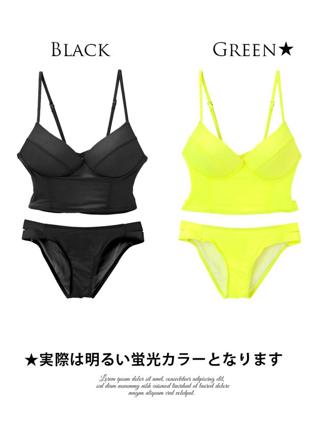 カッコよく水着を着こなしたいお洒落ガールにおすすめ!ネオンカラーがひときは目を引くトライアングル型ビキニ。ブラックも毎年人気のカラーです。バックスタイルも可愛くクロスされております。ノンワイヤーなので締め付け感もなく楽チンです。