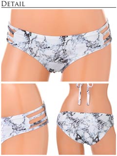 海外でも大人気!今季大注目のデザイン「大理石柄プリント」が登場!お洒落で大人っぽい大理石柄はラグジュアリー感たっぷり。胸元をボリュームアップしてくれるフレアブラには内臓パッド付きで胸に自信がない方でも美谷間を形成。ショーツサイドの4本コードラインがスッキリとシャープな印象にして細見せ効果もあり。上下のメリハリが絶妙なバランスでキュッとくびれを作ってスタイルアップも期待できる。いっきにモードな雰囲気になる最新のデザインで周りの子と被らず、海で一番オシャレに輝けること間違いなし!