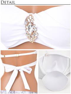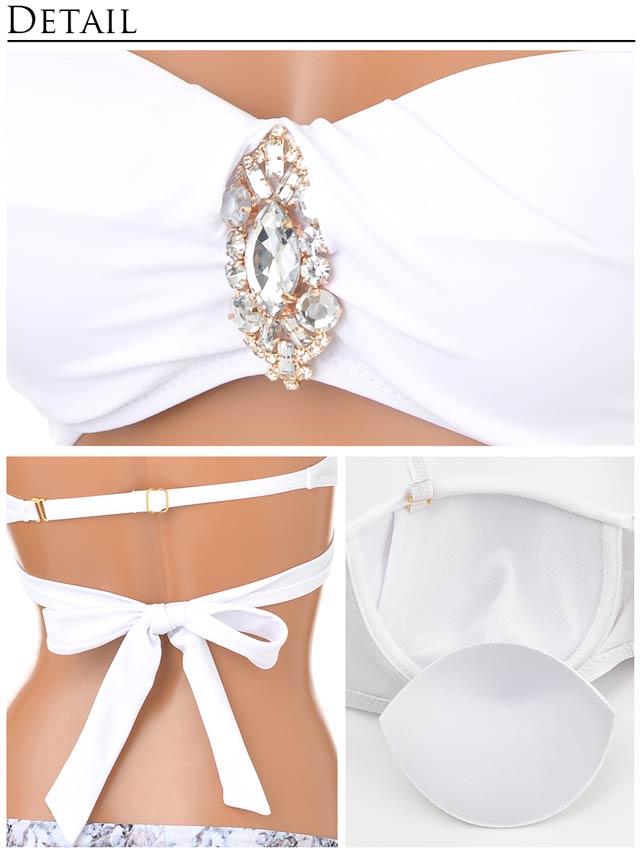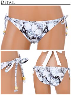 今季大注目のデザイン「大理石柄プリント」から2way仕様ビキニが新登場!胸元でクロスさせてアンダーから着ることで胸元を強調してSexyにキマるデザイン◎ホルターでもアンダーにしても着こなせる優秀デザイン。フロント部分に豪華な大粒ビジューがデコレーションされ存在感を放ちます。ショーツサイドには取り外し可能なリボンがついているので1着で何通りも着れて自分好みに着こなせるビキニとなっております。ブラはアジャスター調節可能なのでゆるゆる、かぱかぱの心配もなし。自分に一番合ったサイズ感でよりキレイに着こなせます。