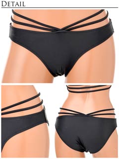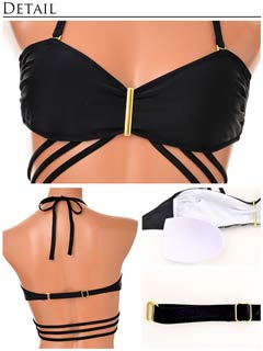 インポートデザインを取り入れた、体に絡みつくブラックラインがSexyなビキニ。ブラのアンダーには、細い3本のストリングをかざり、女性らしい「くびれ」を強調してくれます!ボトムにも2本のストリングをかざり、よりSexyに。ブラのホックもは自由自在に調整ができるアジャスタータイプ!ビーチで、他の子とかぶりたくないアナタにぴったりなセクシービキニです☆