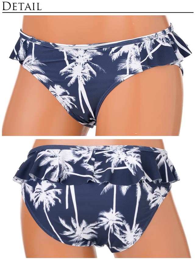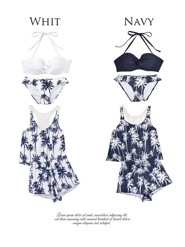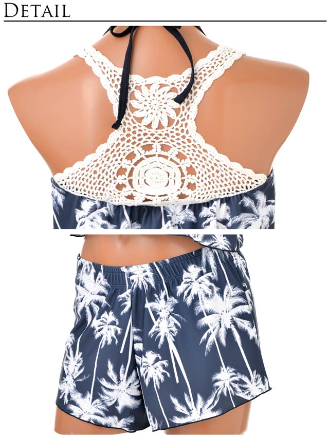 リゾート感漂うパームツリー柄ビキニ!バックレースデザインのトップスとショートパンツがついた4点Set。ビーチサイドでも1番可愛くいれちゃいます♪ビキニのブラはワイヤー入り&取り外しができる下厚パット付き。カシュクール風デザインで、バストに立体感もプラスしてくれます!「水着は盛れない・・・」という小胸さんにもおすすめ◎バックホックはアジャスターだから、自分で調整可能。トップスは、バックにレース、ショートパンツはボトムとおそろいバナナリーフ柄です。トップス&ショートパンツは、水着と同じ素材だから、水に入ってOK♪最高の夏にしたいなら、絶対このビキニがオススメ◎