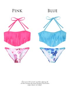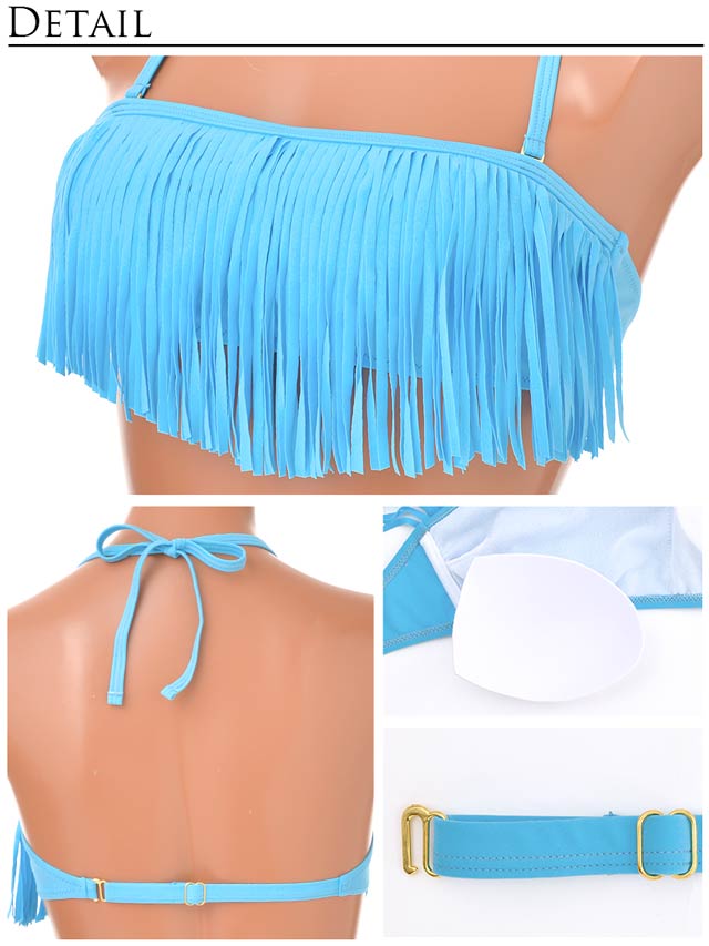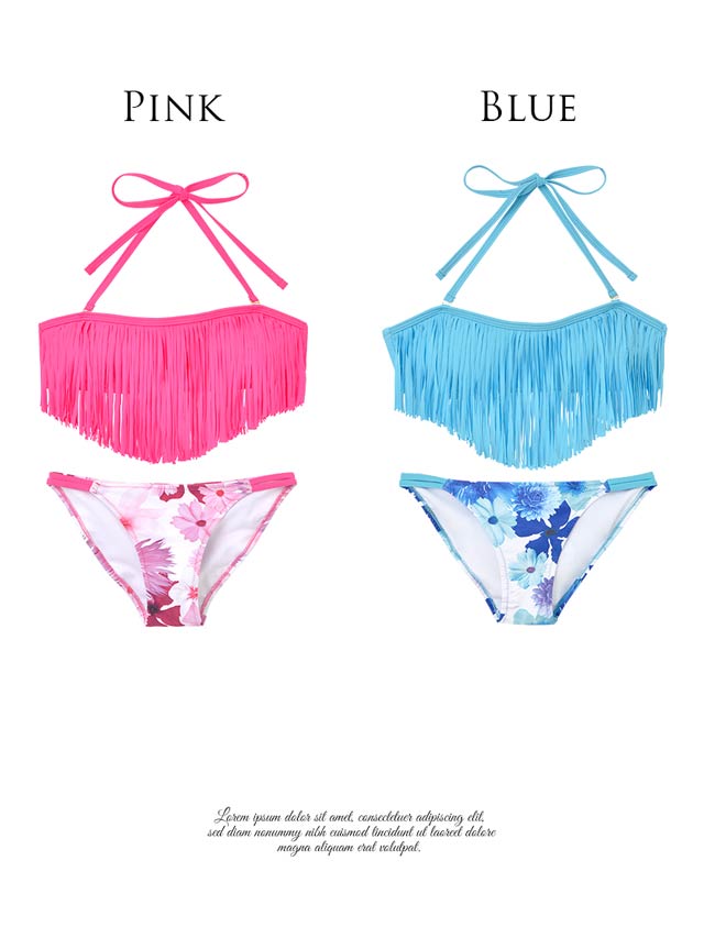 去年、大・大・大好評だったフリンジビキニがパワーアップしてかえってきた☆+゚揺れるフリンジがバストをボリューミー見せてくれます♪フリンジをVカットにすることで、女性らしい「くびれ」も強調できちゃいます♪ストラップは取り外し可能な2WAY仕様。バックホックは自分で調節できるアジャスター仕様。ボトムは鮮やかな花柄で、最新トレンドの「ミックスマッチ」デザインになっています!イロチ買いで、友達との双子コーデもオススメ◎