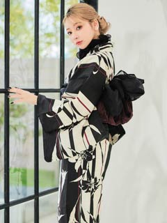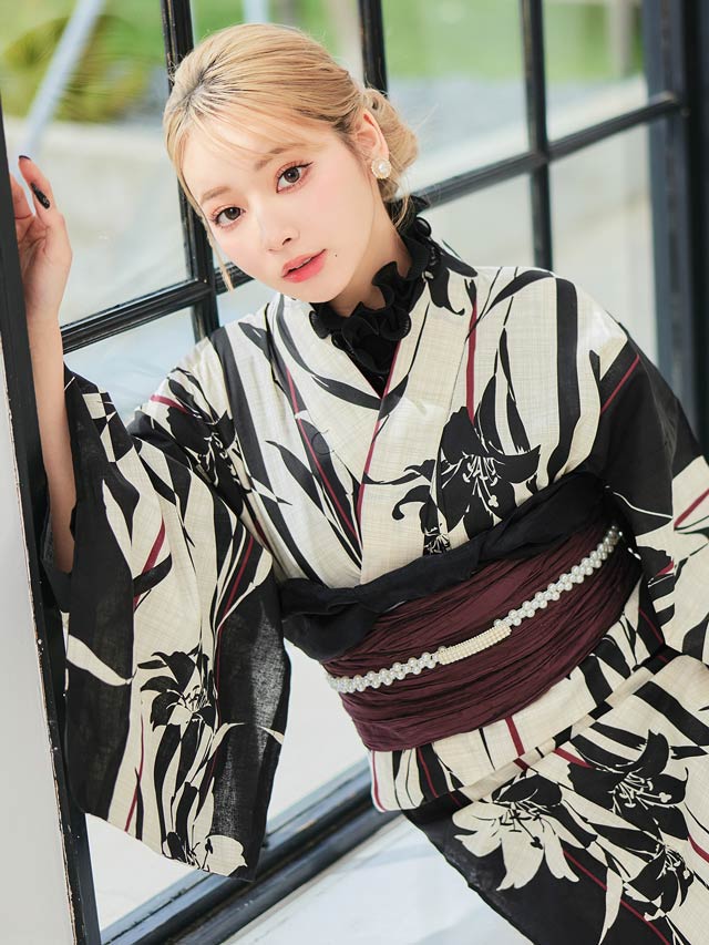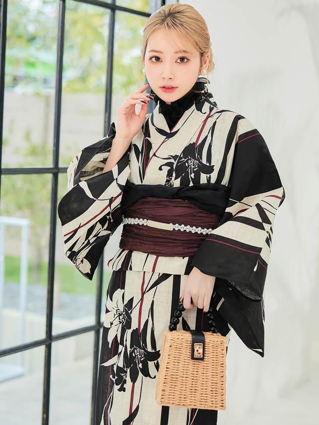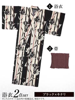 [2点SET]縦縞モノクロ百合柄浴衣【YUKATA by dazzy 2025】
