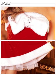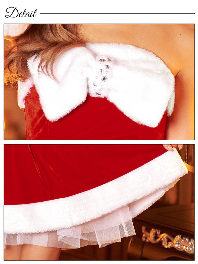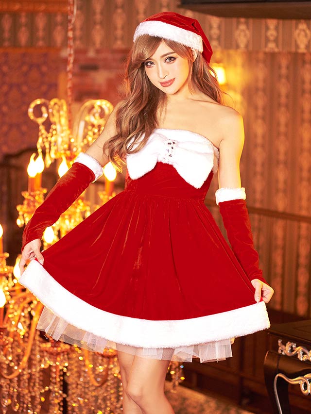 フロントの大きなリボンがCUTEなサンタドレスセット。ふわふわの大きなリボンでどのサンタコスプレよりも断トツ可愛く見えちゃいます♪リボンの中央にはキラキラのビジューとパールがついているので、安っぽく見えることもありません!ふわっと広がるAラインシルエットのドレスの中には、チュールが入っているのでパニエを履かなくてもボリューム感バッチリ!気になるお腹もお尻も、太もももカバーしてくれるデザインです。アームウォーマー、サンタ帽子の3点セットで今年のクリスマスは可愛いサンタに変身してネ♪