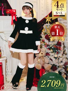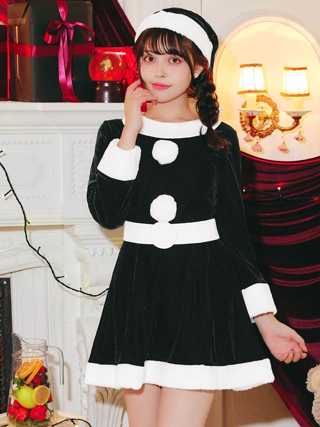 • [4点SET]ベルト付きフレアサンタワンピースセット【2025サンタ/コスプレ】(ブラック-Sサイズ)