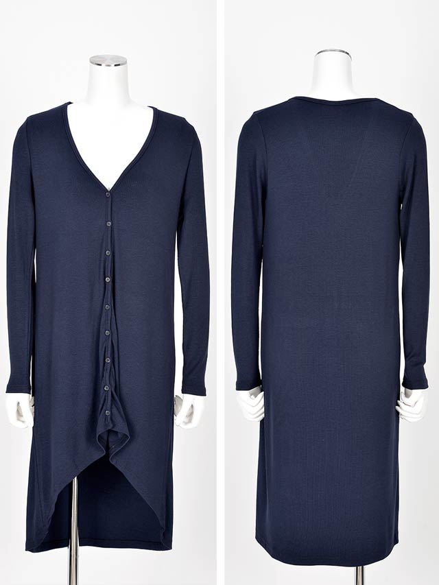 しっとり柔らかな軽い肌触りと質感のシンプルなVネックの高見えハイゲージ大人ロングカーディガン。