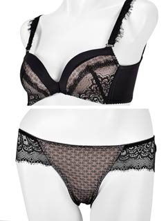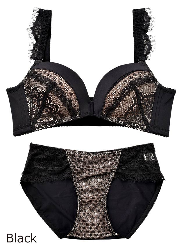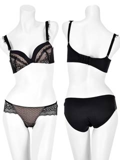 アンダーにはワイヤーを使わず、下厚の内蔵パッドと、アイラッシュレースでデコレートされたしっかりとした太めストラップで、バストをぐいっと押し上げてボリュームアップ。ショーツと2点セット。