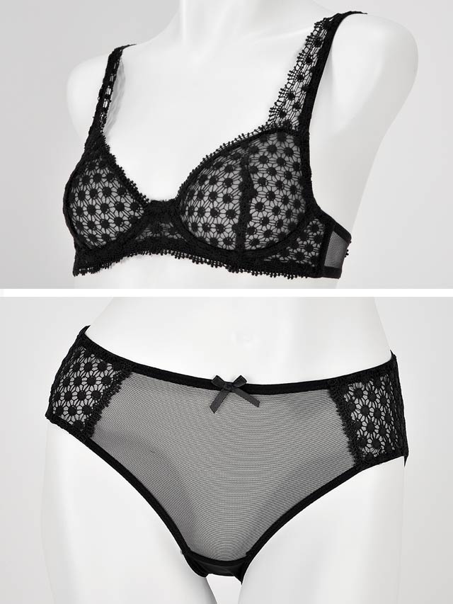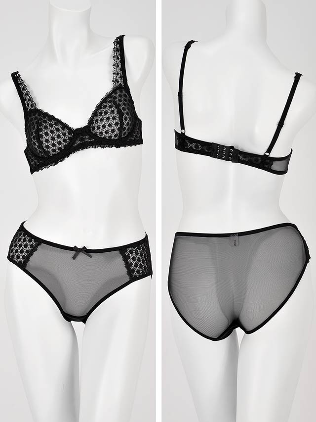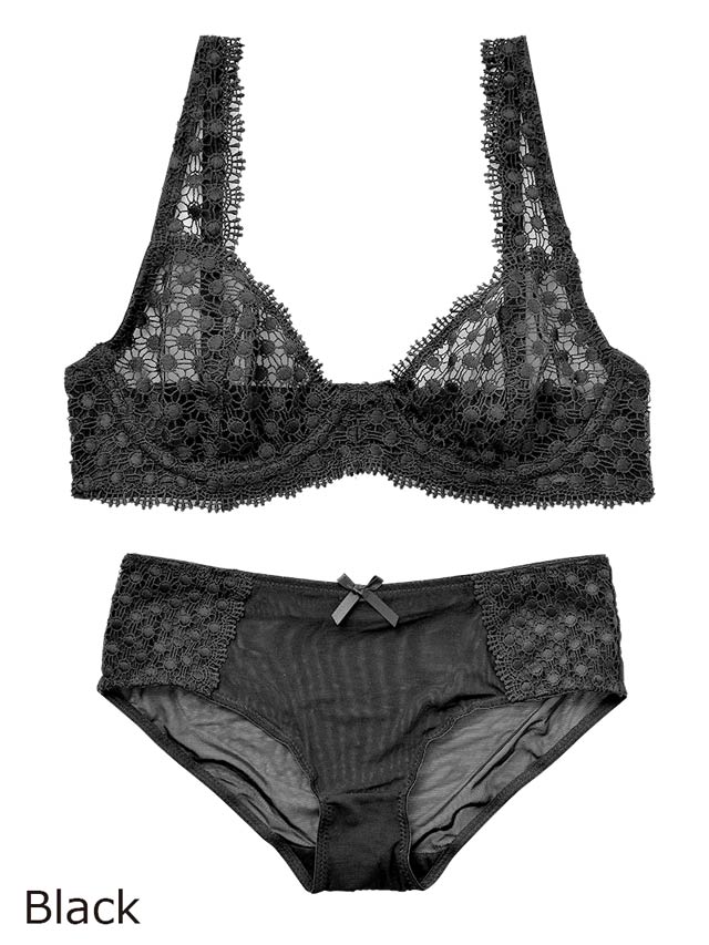 花柄×ネット調のケミカルレースにシックな色気が溢れる、ワントーンブラ。単色で甘すぎない大人のピュアセクシーさがあります。サイドは透け感高め。アンダーのスカラップレースで愛らしさも。