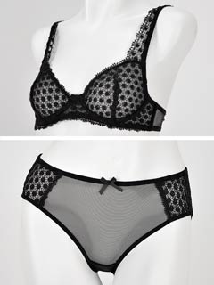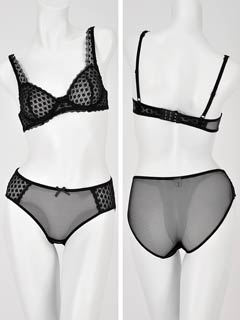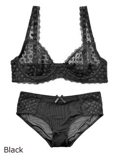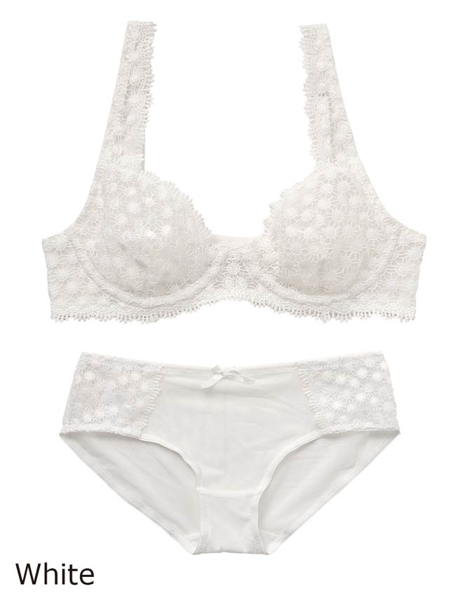 サイドが高め形状のワイヤーループがバストをしっかり囲み、カップにイン。ショーツと2点セット。