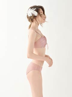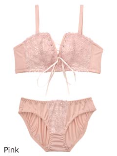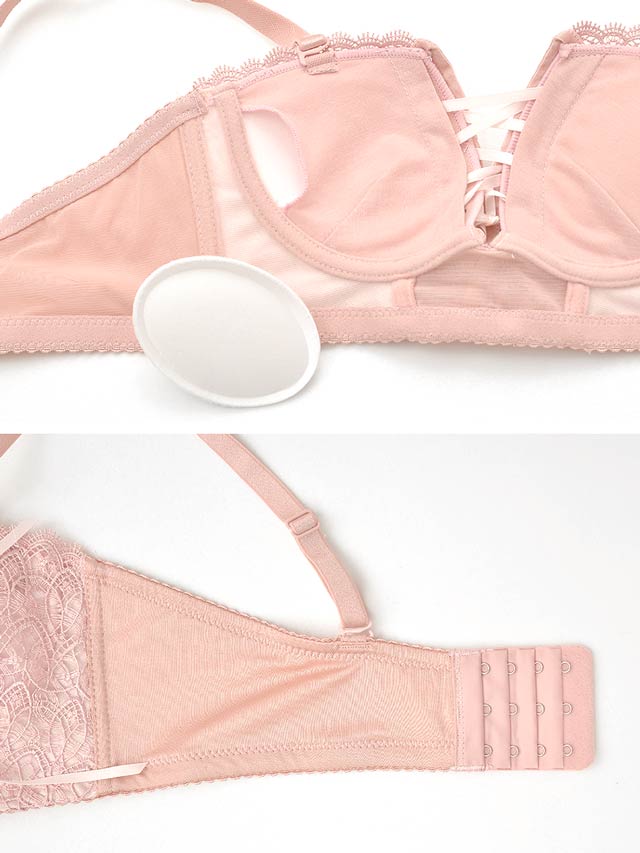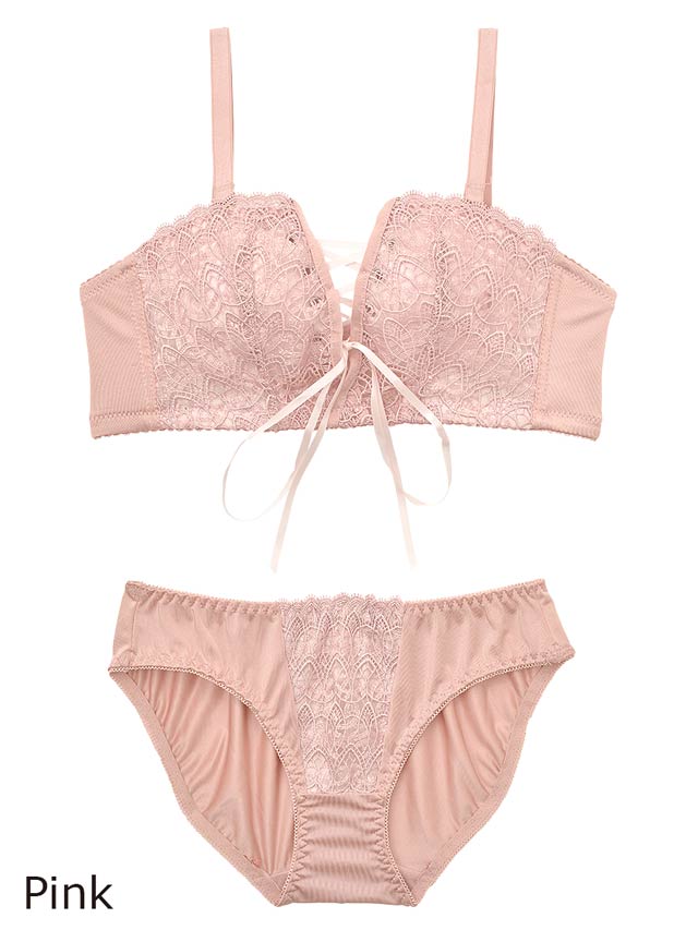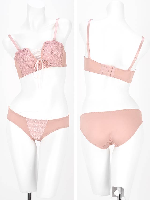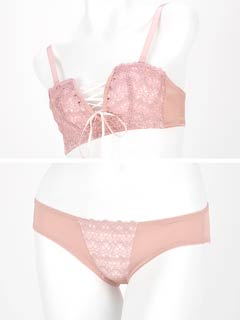 ケミカルレースにフロントレースアップがアクセントの盛りブラレット。単色ゆえ甘すぎず、大人びた表情を見せます。取り外し可能なパッド&フロントのレースアップで谷間を自由に調整できます。ショーツと2点セット。