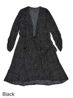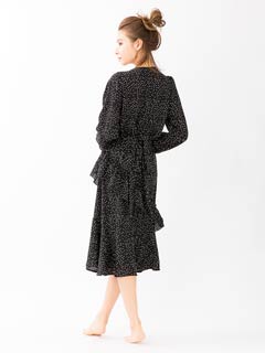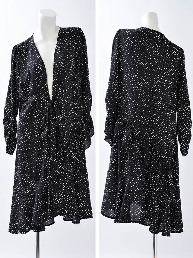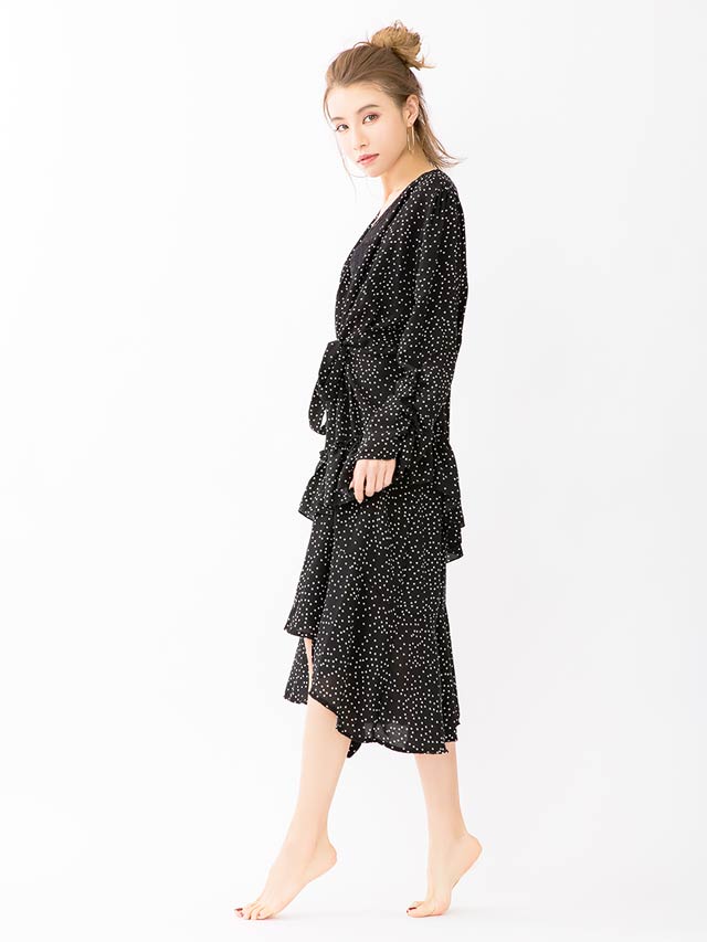 トレンドのマルチドットとウエストリボンがポイント。ヒップラインにアシンメトリーに施された流れるフリルが可愛いながらも、いつもとは違う、甘さをおさえたロマンチックな大人の女性を演出。