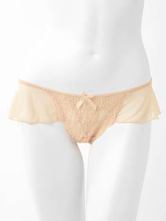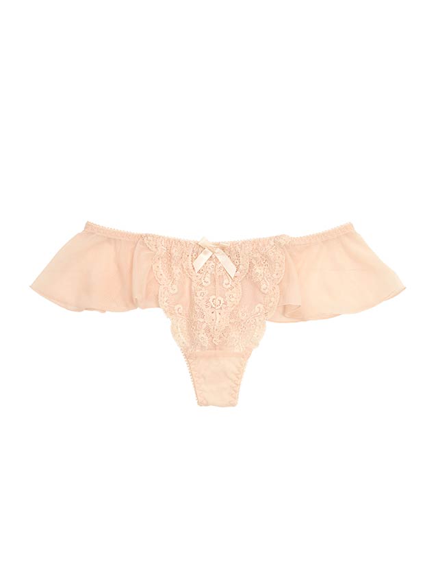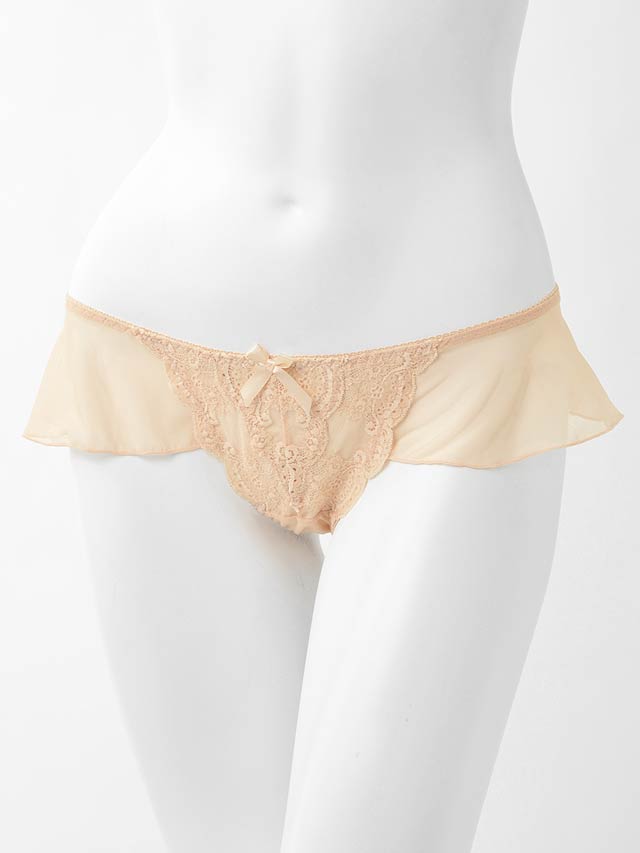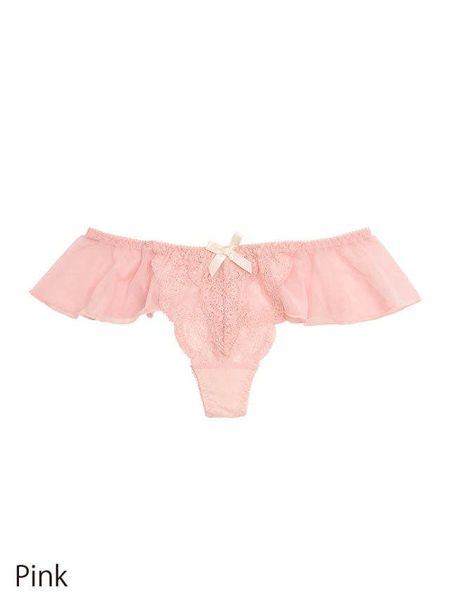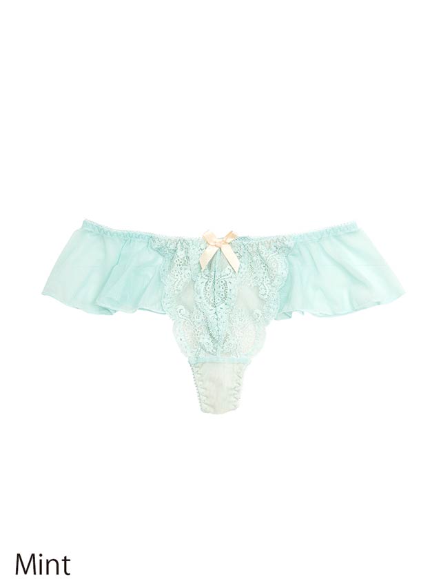 ウエストラインを気まぐれに、フリリーなソングタイプのTバックショーツ。ピュアフルでふわりと華やかなパステルが可愛らしい。フロントはシアーなカラーレースにネットを裏打ち。肌がほのかに透けて色っぽい。