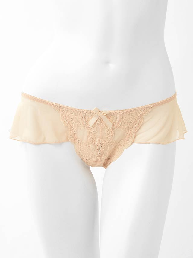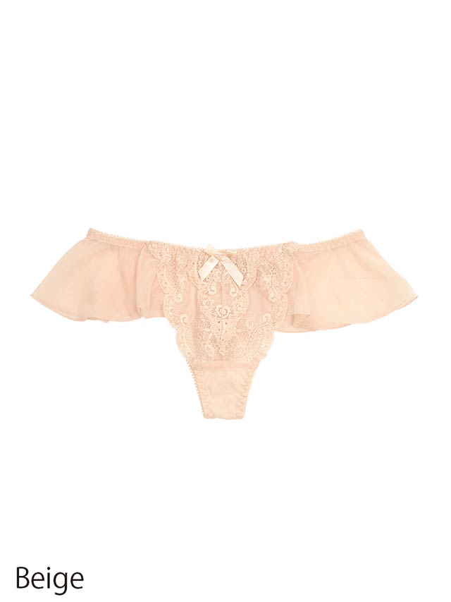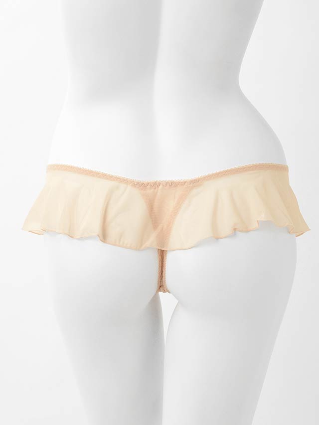 ボリュームのある腰まわりのフリルが、Tショーツが初めての方も比較的違和感少なく着用できるデザインに。クロッチ部に別布付き。Tショーツ単品。