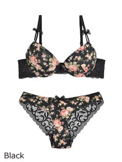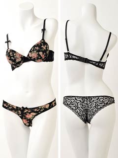 ショーツはバックスタイル透け仕様。クロッチ部に別布付き。ブラとショーツの2点セット。
