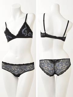 ショーツは総レース透け仕様。クロッチ部に別布付き。ブラとショーツの2点セット。