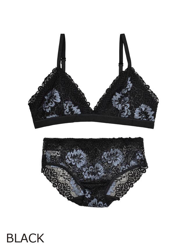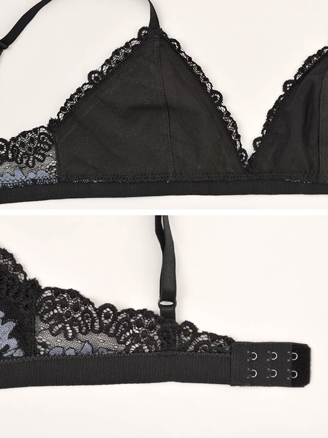 トライアングルブラこそ、ラグジュアリーに。素肌の上で花開く大人の色っぽさを秘めた総レースのノンワイヤーブラレット。