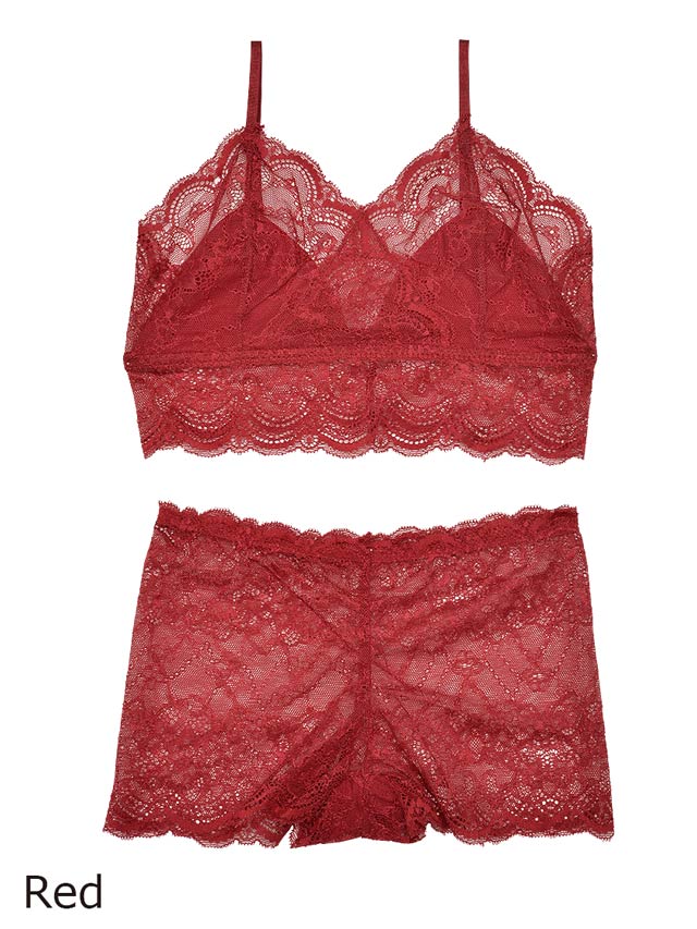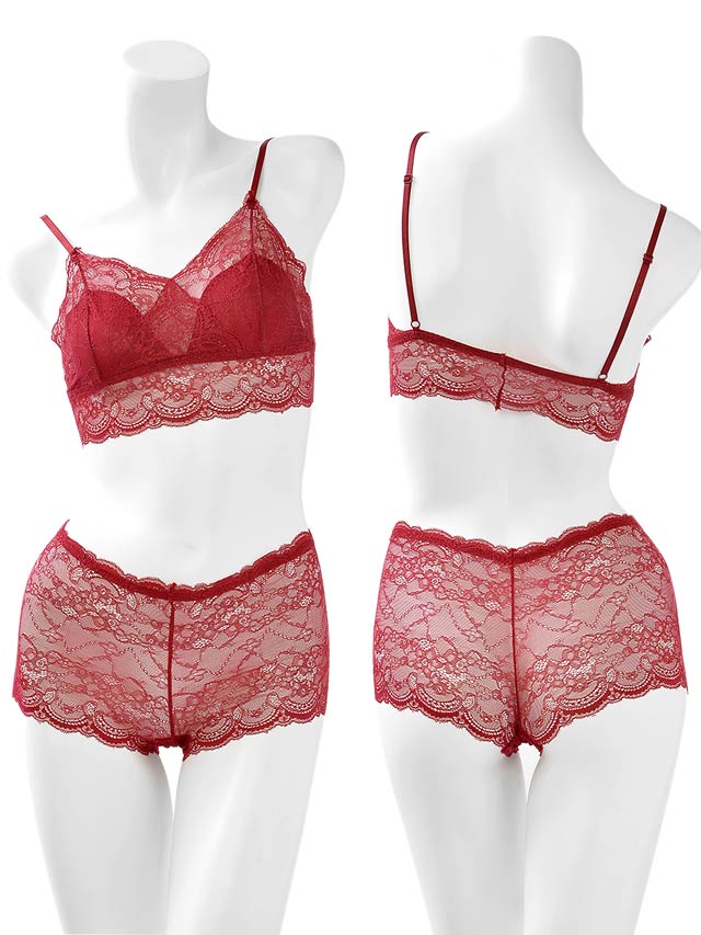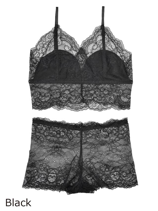 素肌に吸い付くように心地良くフィットするボーイレッグも、レースフルでセクシーに。ショーツは透け仕様。クロッチ部に別布付き。ブラとショーツの2点セット。