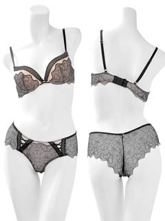 ショーツは透ける仕様。クロッチ部に別布付き。ブラとショーツの2点セット。