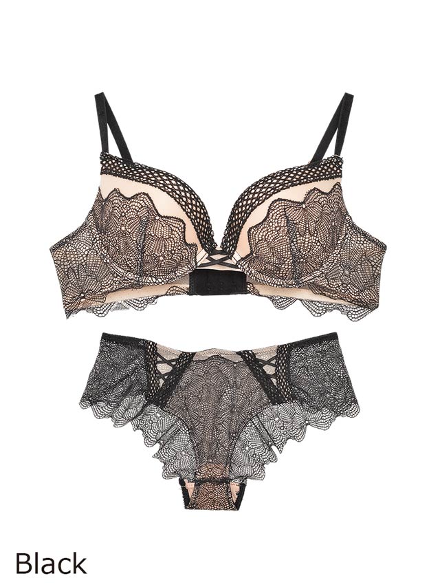 素肌の上で花開く、大人の色っぽさ。ブラックレースに包まれたバストメイクブラ(盛りブラ)。