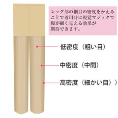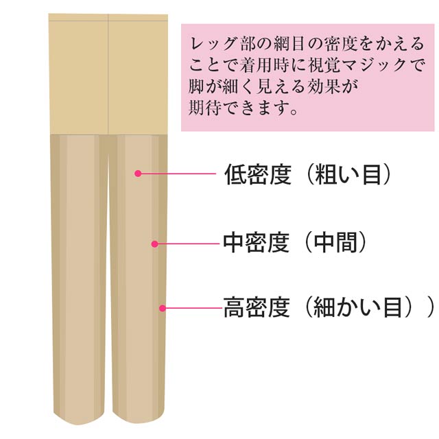 シャドウ編でスリムに変身!特殊な編み方で脚周りの編密度に変化を持たせました。高密度・中密度・低密度の目をループ編成することで、足に縦長の濃淡を作り、脚を実際より細く見せてくれます!さらにヒップラインを美しく見せる立体設計。静電気防止加工・抗菌防臭加工・吸汗加工なのも、これからの時期に嬉しいポイントです!薄めのタイツは季節を問わず一年中使えるので、何個あっても便利ですよ♪
