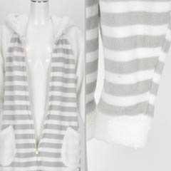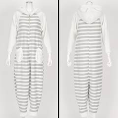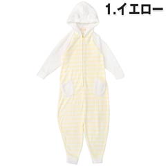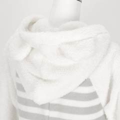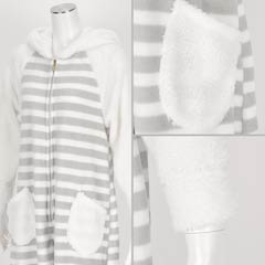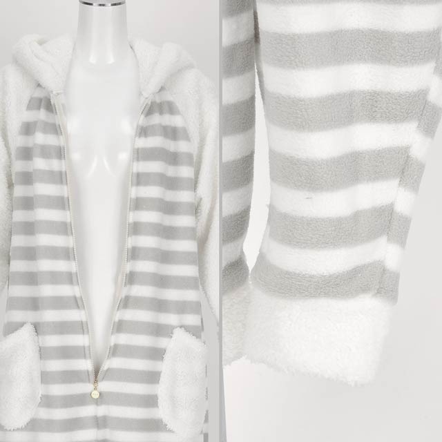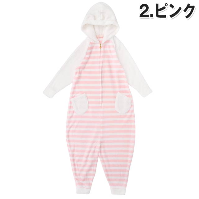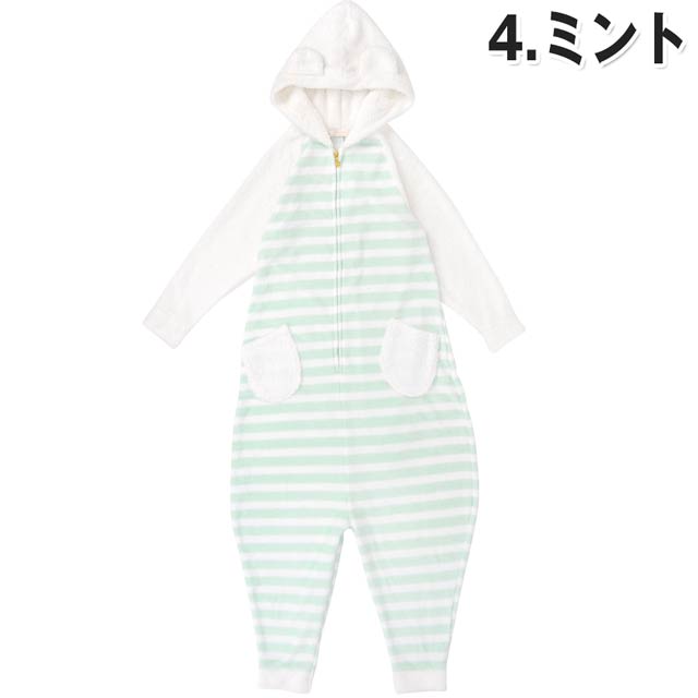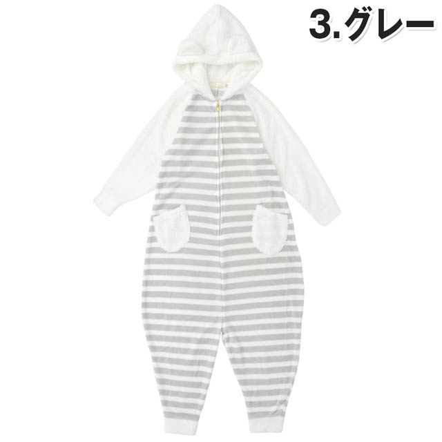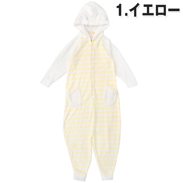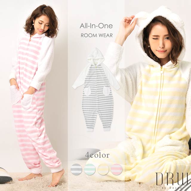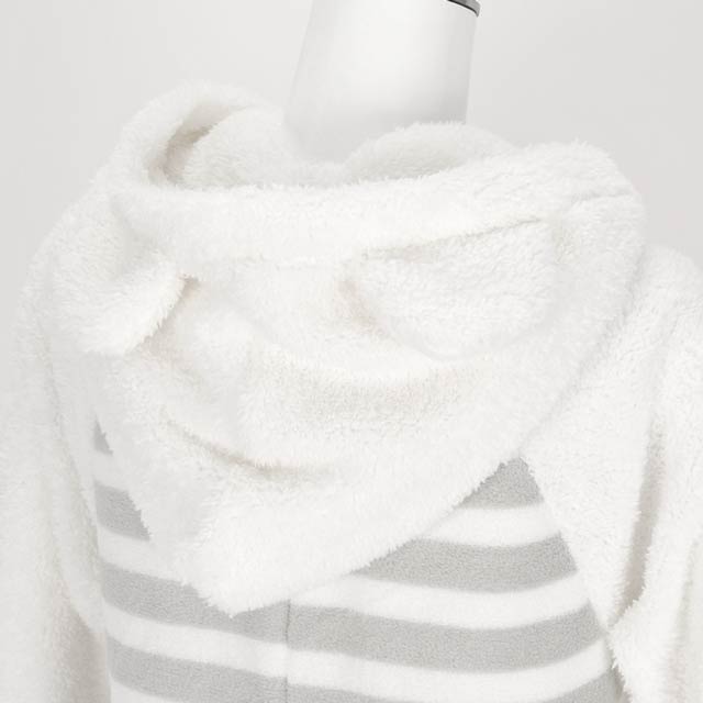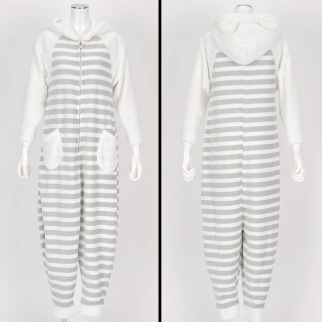 オールインワンに人気のボーダー柄の新作登場!フードには可愛い"耳"付きで、かわいいくまちゃんになれちゃいます。フードや袖部分はボア素材なので、あたたかさもバツグン!毛布にくるまったように中は"ヌクヌク"はこの冬、大活躍間違いなしですよ!