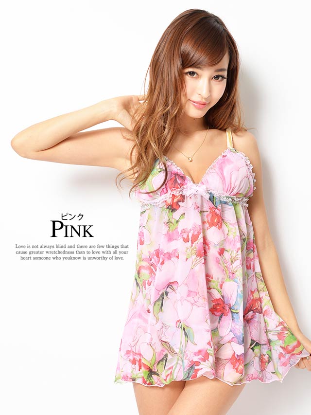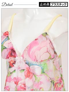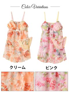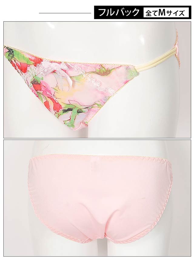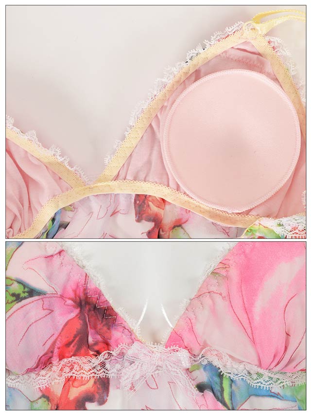水彩タッチで描かれた夢心地なハーモニーを奏でフラワー柄が印象的。カップ上辺にはフリルがたっぷりとあしらわれておりとってもスウィートなデザインに!ストラップ部分やゴム部分をシフォン素材とはことなるカラーにしたことでフェミニンなバイカラーデザインは女子の心を掴んで離さないデザイン、ノンワイヤーなのでリラックスしたい日におすすめです!