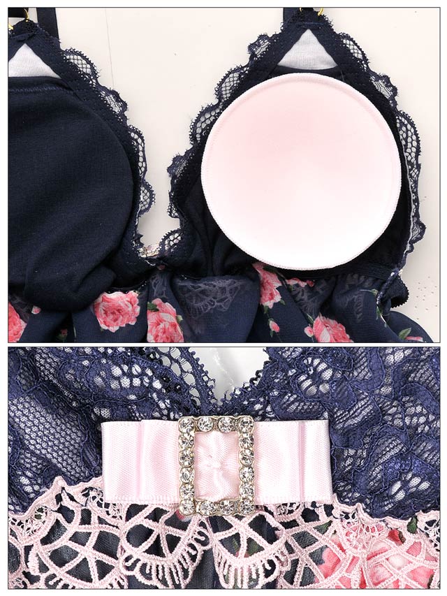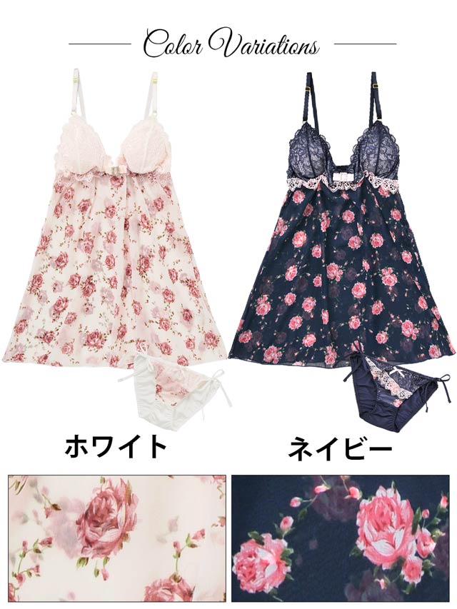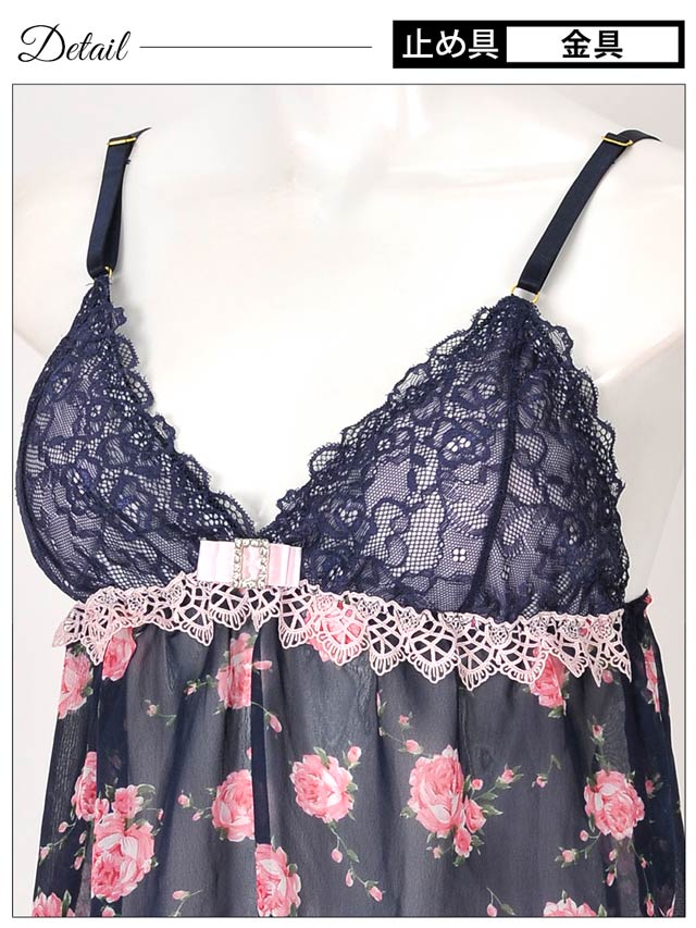 繊細なケミカルレースとコードレースで仕立てたCUTEなベビードール♪バストの中央にはキラキラ光るスクエア型のチャームをデコレーションしました。透け感のあるシフォンにはレトロなROSE柄をプリント。ショーツは「ほどける」紐パンなので、勝負下着にもオススメですよ!