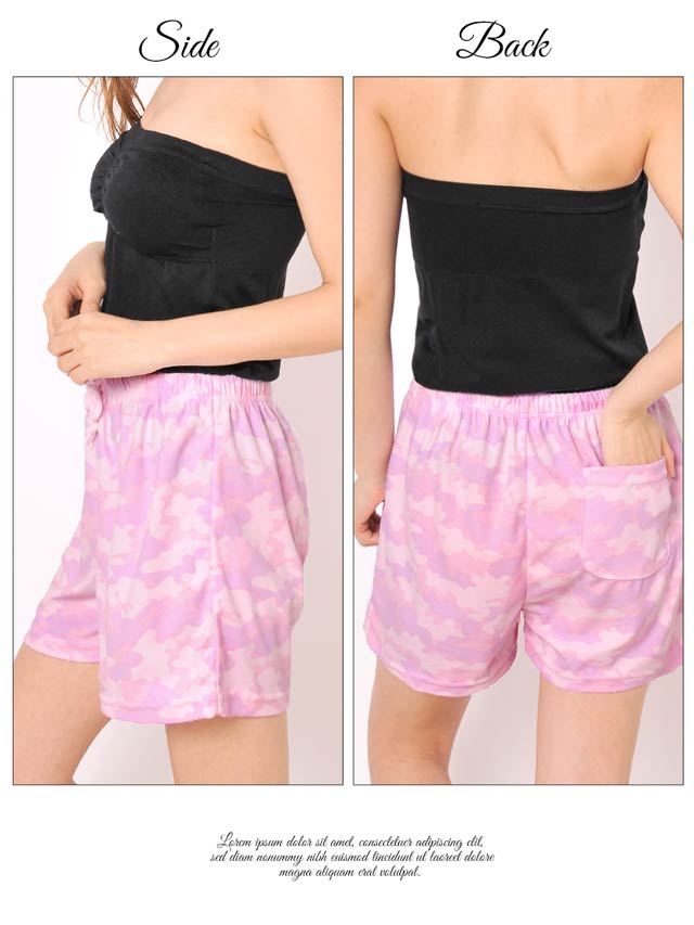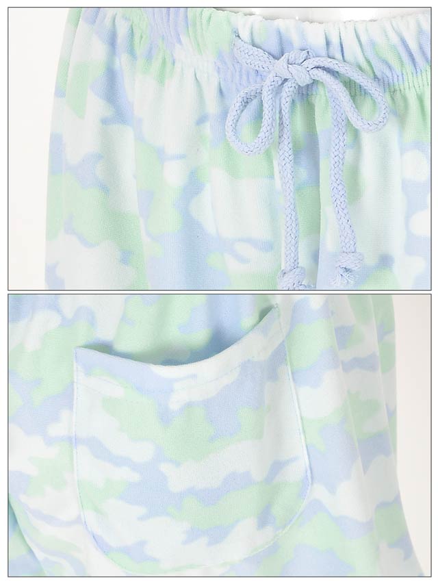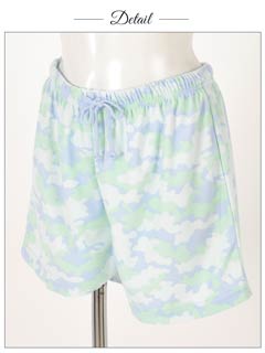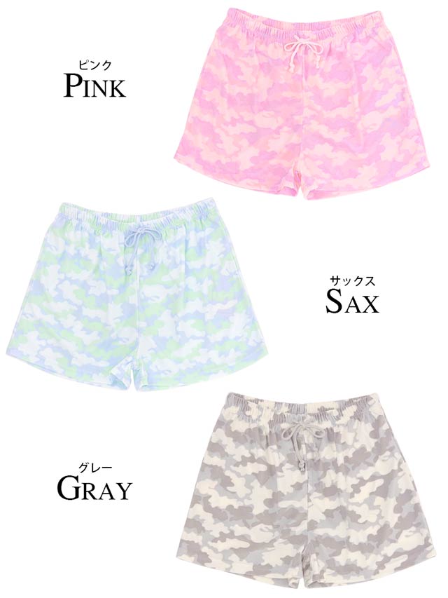 トレンド問わず人気な迷彩柄のショートパンツ★淡いパステルカラーで仕立てているので迷彩柄でも強めにならず、ルームウェアらしい着こなしができます♪ウエストがゴムで履きやすいのもポイント!肌触りも抜群です!