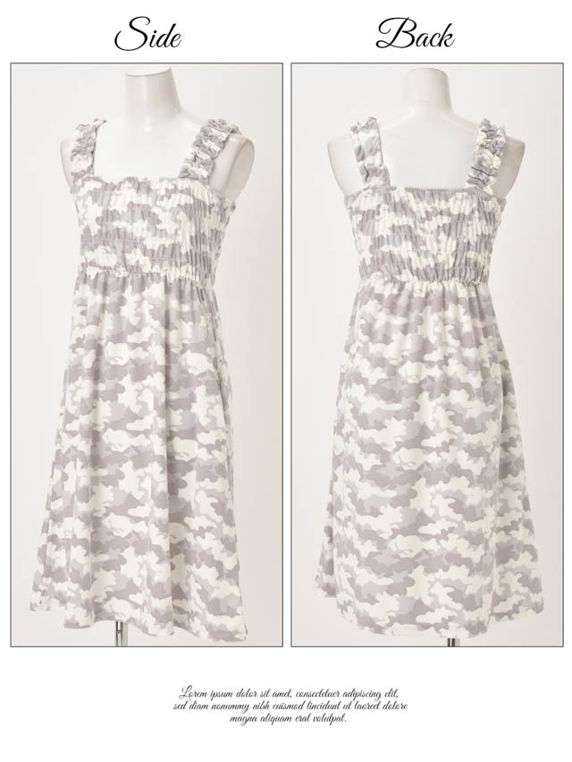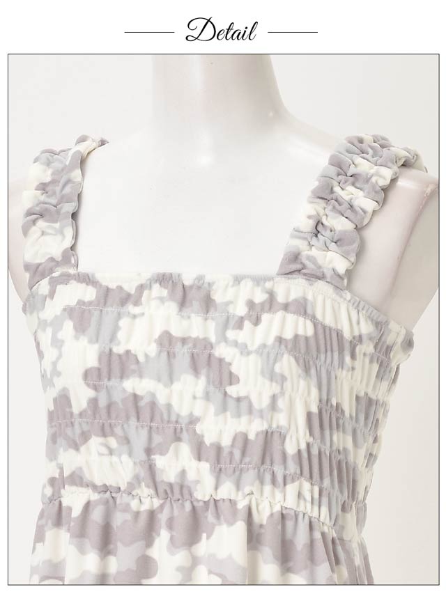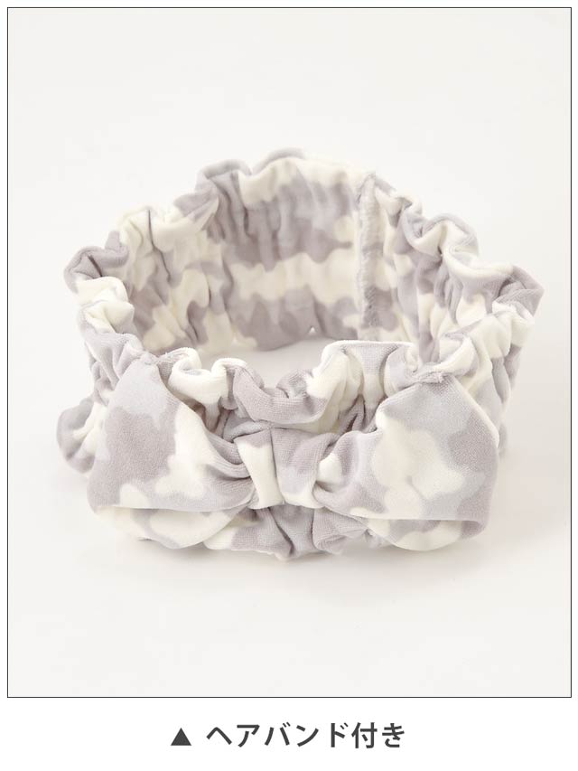 さわり心地抜群のパイル生地で仕立てた、大人気のパステル迷彩柄ルームウェアワンピ。バスト部がゴムギャザーになっているので、伸縮性・フィット感も◎おそろのヘアバンドもついてきますよ!お風呂上りや暑い夜に大活躍の予感…♪